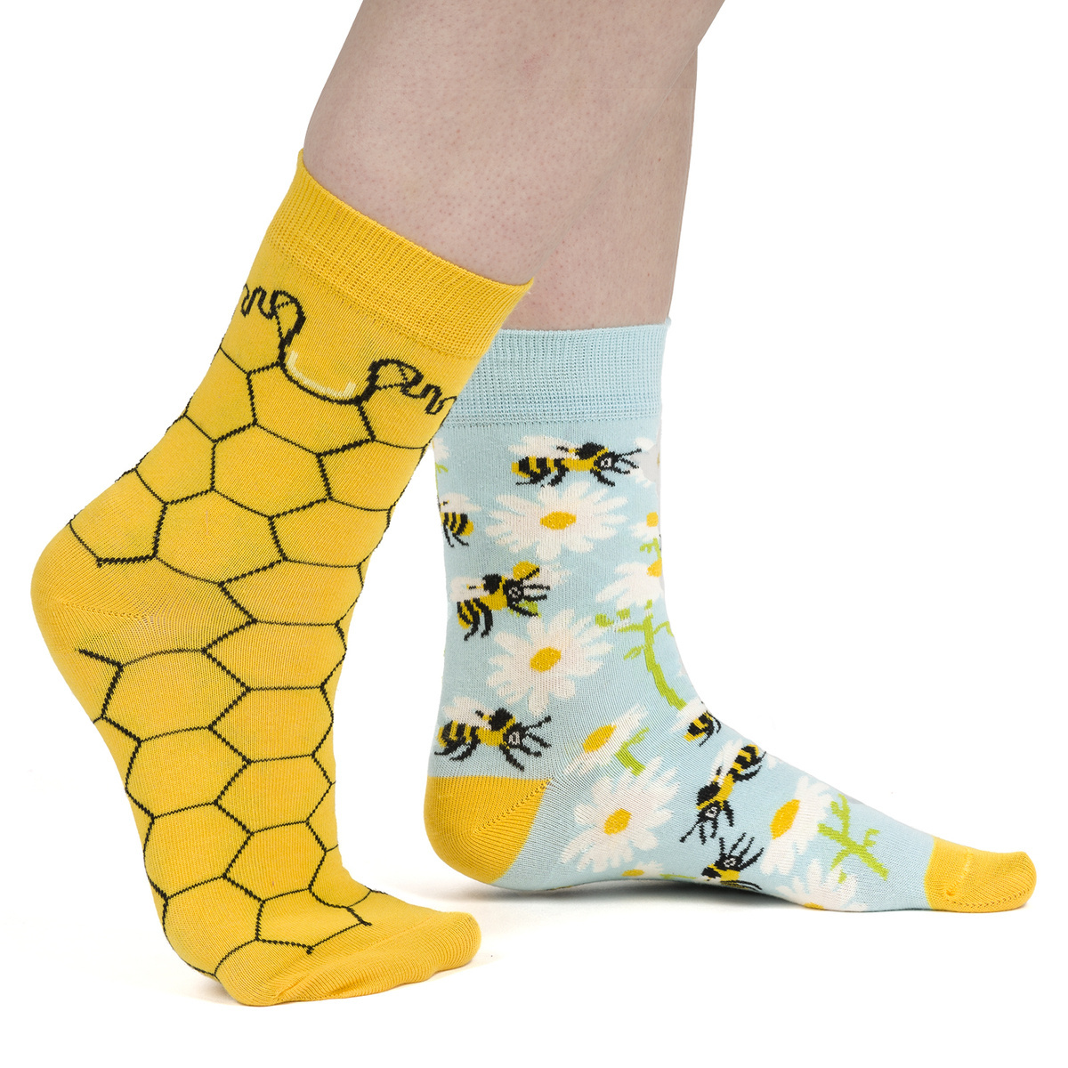 Are you wondering what to surprise your girlfriend with? Definitely honey socks in a jar are the perfect model. Bright, cheerful colors will brighten her wardrobe and will take care of individual styling. In addition, the socks are a mismatched model, which gives them even greater uniqueness. The combination of yellow honeycomb with blue and bees will be perfect for your look.
