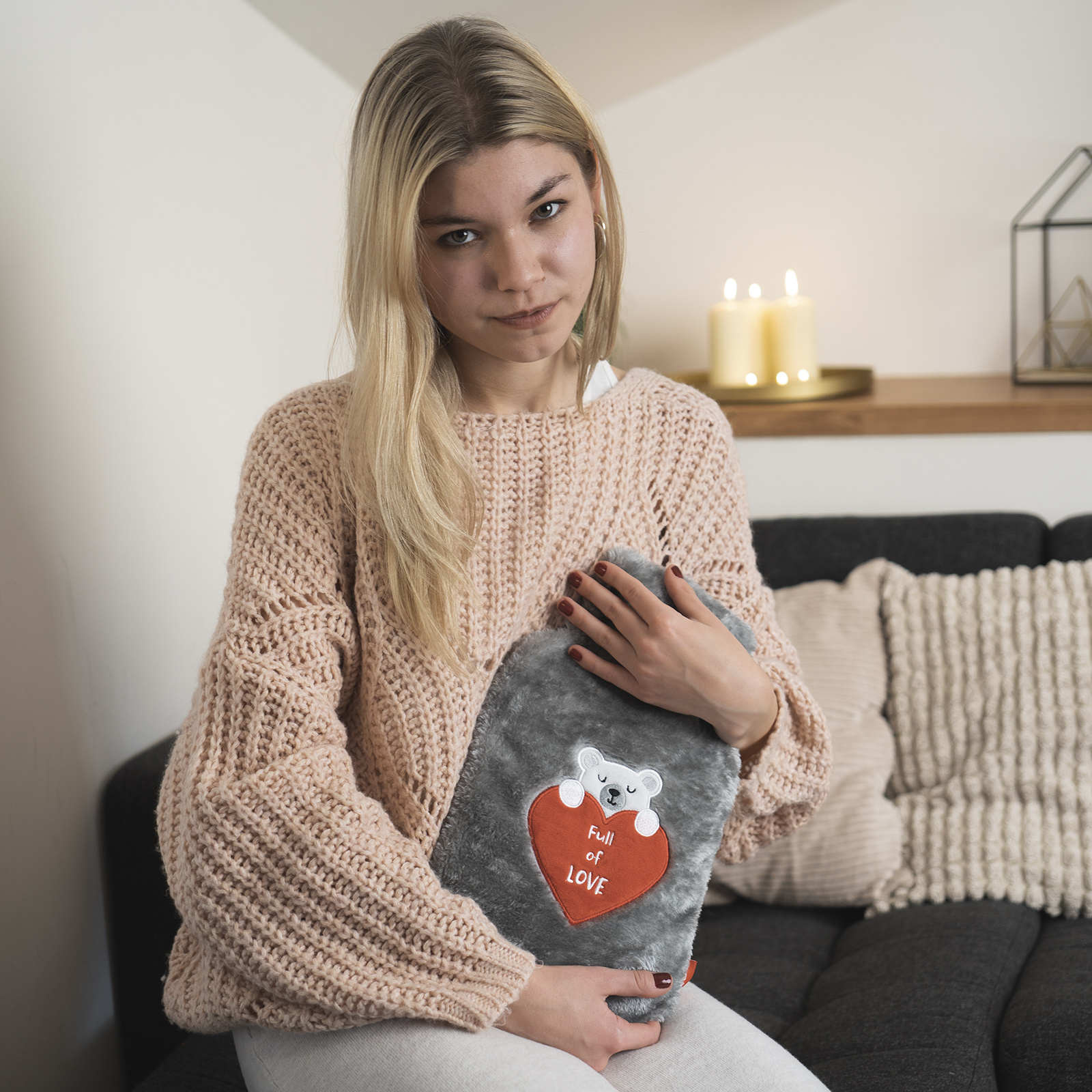 The hot water bottle is in a soft, gray plush cover, thanks to which you can hug it with pleasure. Its warmth will make you feel blissful and you will easily relax after a hard day. It is also a great gadget for cool autumn and winter evenings. They will make relaxing under a blanket with your favorite movie or book more pleasant. Indispensable for those who are cold - it will warm up cold feet;)