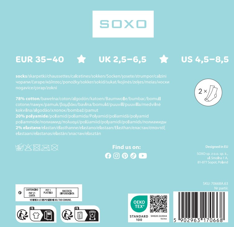 Go on a journey through unknown corners with Soxo socks and enjoy the comfort of every beautiful day. They will also be a nice gift on the occasion of Mother's Day, Boy's Day or Valentine's Day. You can also donate these unique bottoms on no occasion, because it doesn't always have to be the case! Getting gifts is a nice gesture, because who of you doesn't like to receive them? Choose a unique package full of delicious, soft socks and give them to your girlfriend, mother, sister or wife.