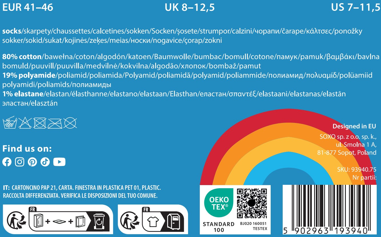 - Go beyond the pattern and enjoy colorful socks with a rainbow motif. They will enhance your styling and provide comfort all day long. New challenges are already waiting for you! Choose comfort and convenience with Soxo socks.