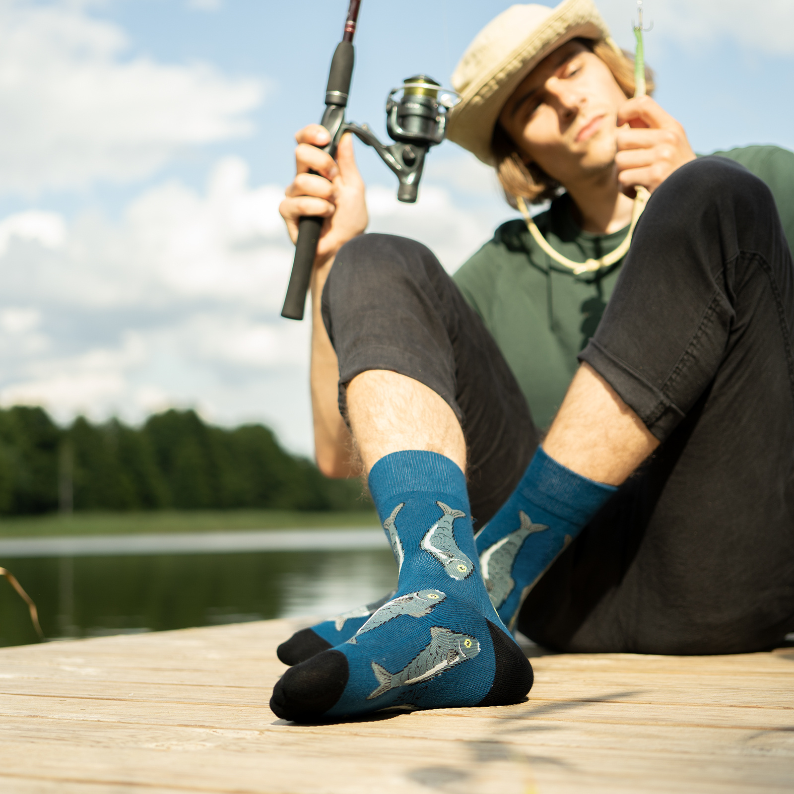 - Funny socks are decorated with sardines. Their color will blend well with your closet.