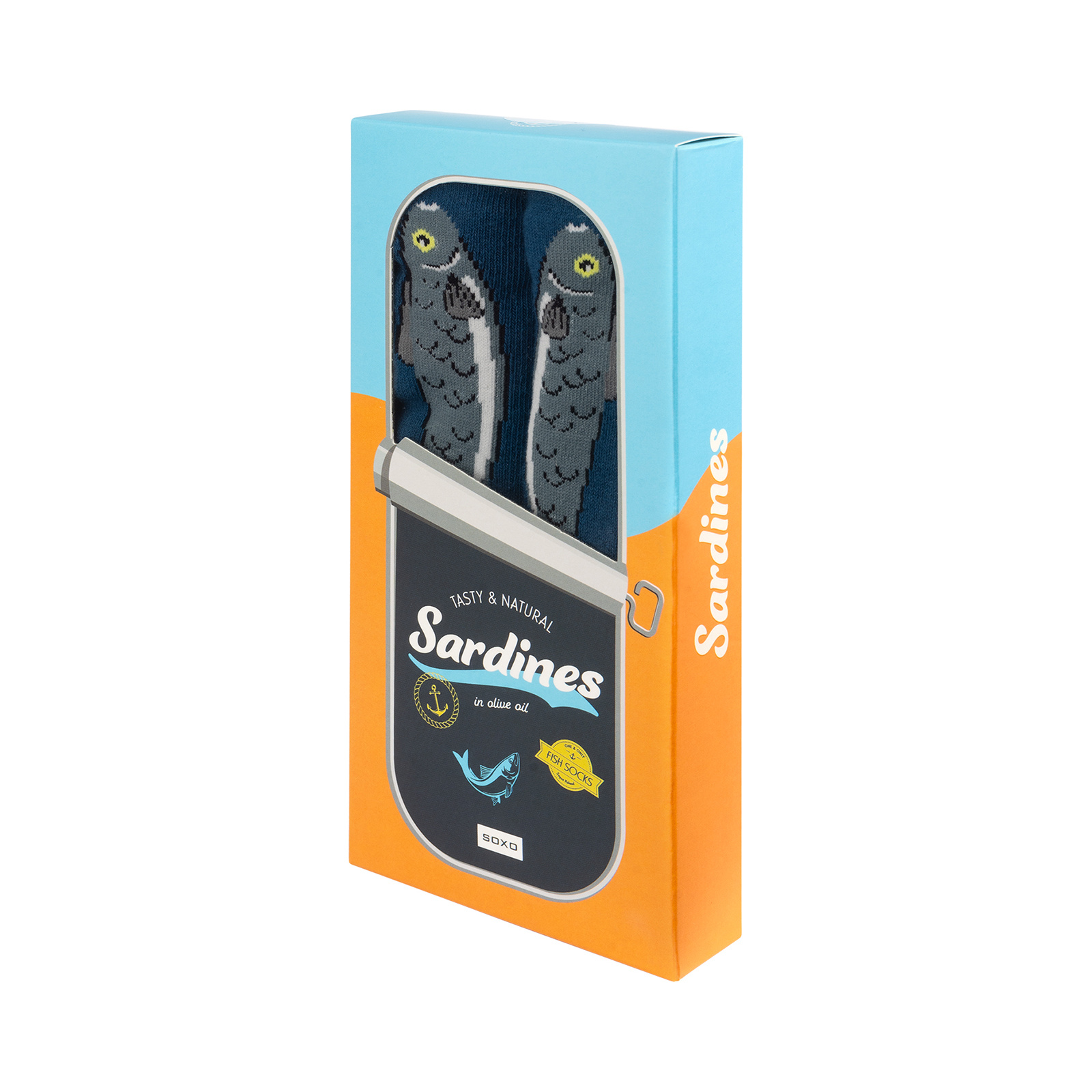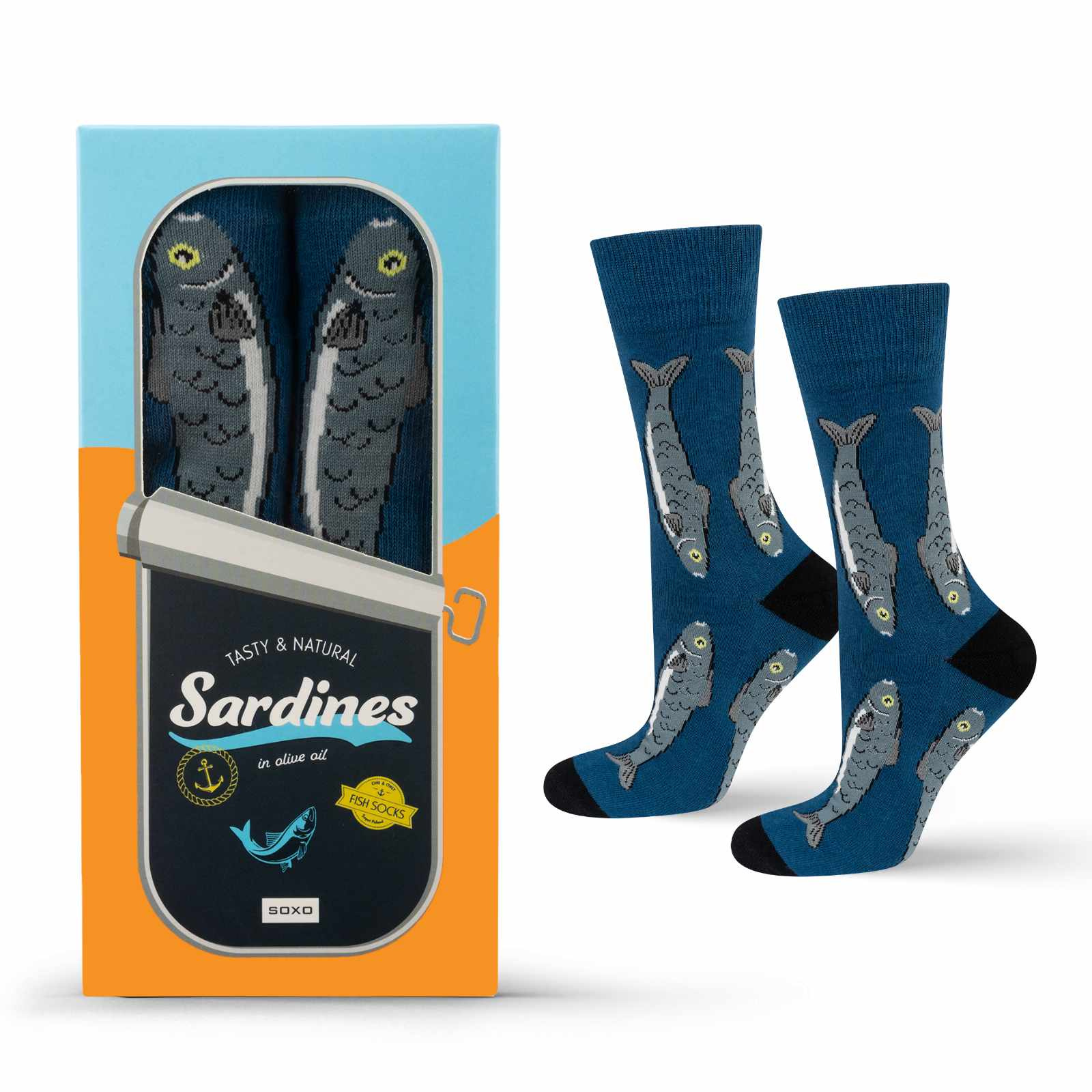 - Cheerful sardine socks in a package is the perfect model for fans of sea travel. A funny model will work as a gift idea for a man of any age. Complete your closet with interesting patterns.