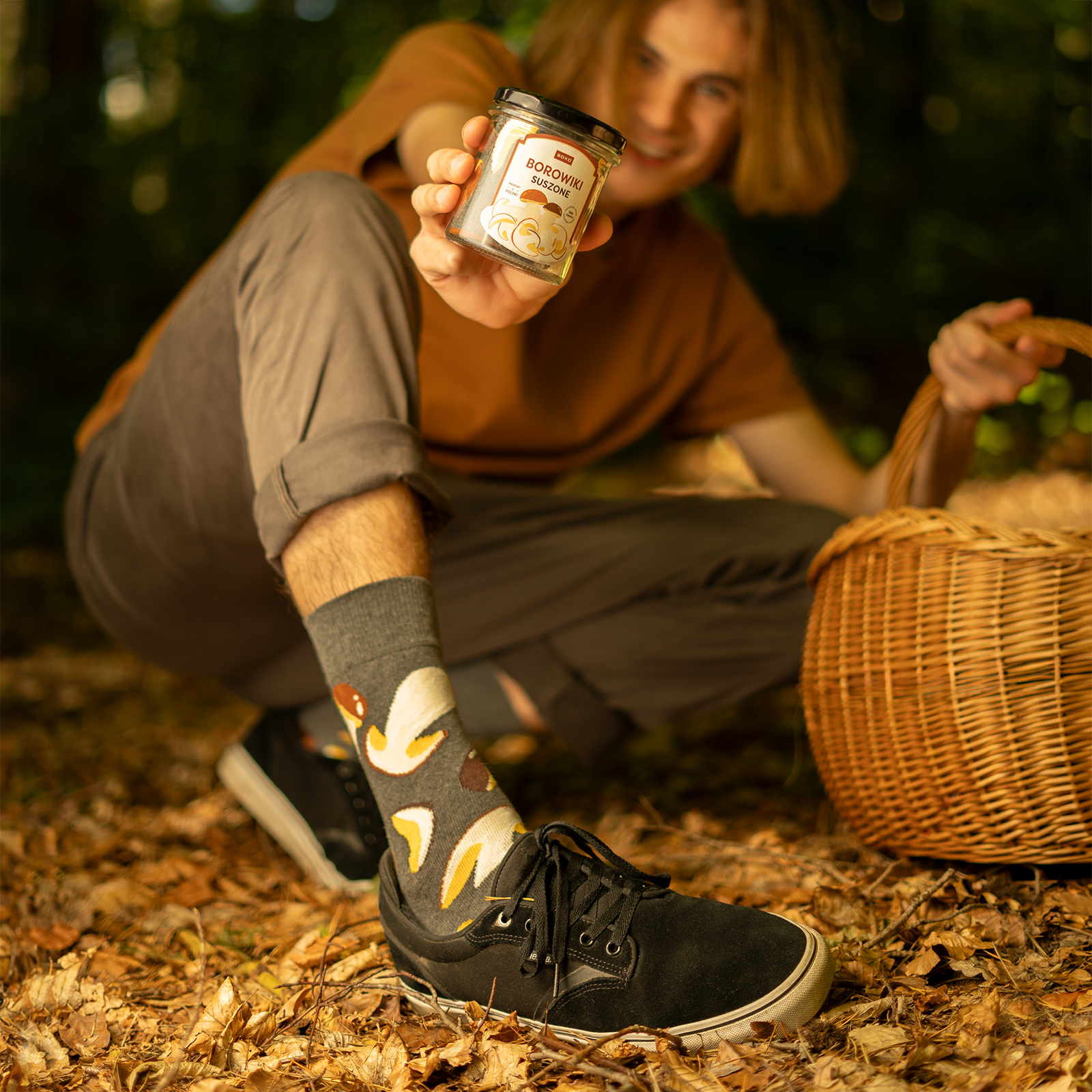 The socks will appeal to the greatest lovers of boletes in a decorative package such as a jar. Colorful socks for him are a unique gift idea for the Day of the Boy. With them there is never boredom, and the company of dried boletes on the feet is a great addition to the styling for the party.