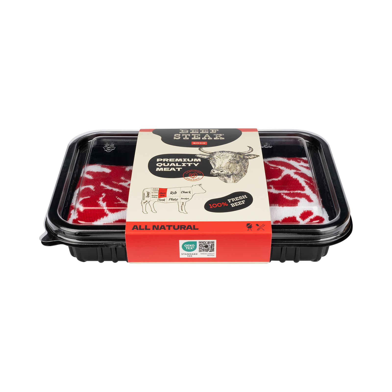 - steak socks are placed in a unique package which is deceptively similar to a tray with a real steak from behind the counter in a butcher store