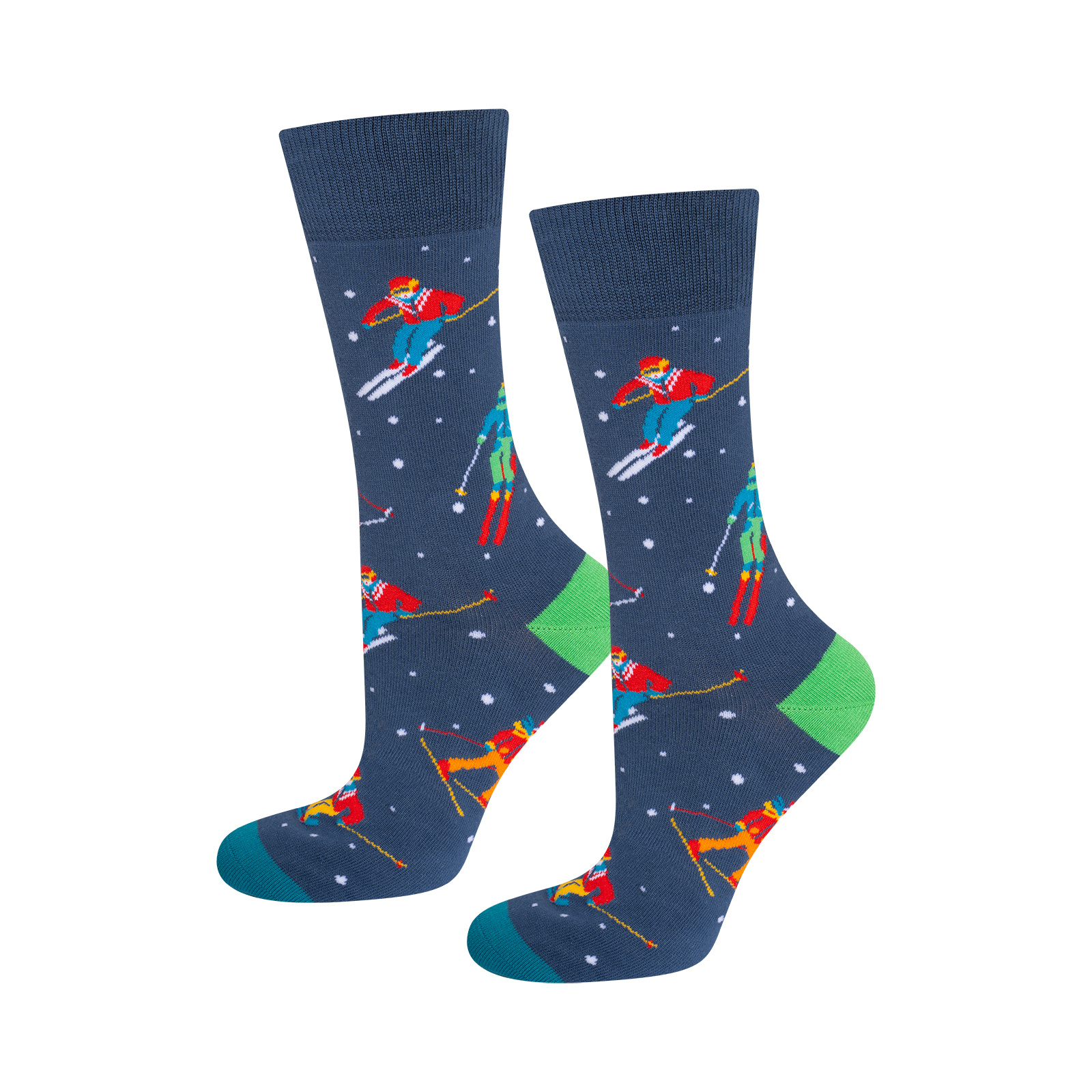 Colorful socks with a skiing motif not only add character to any outfit but also bring a smile and highlight a passion for winter sports.