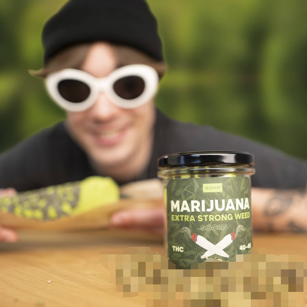 Men's colorful SOXO GOOD STUFF marijuana socks in a jar funny cotton