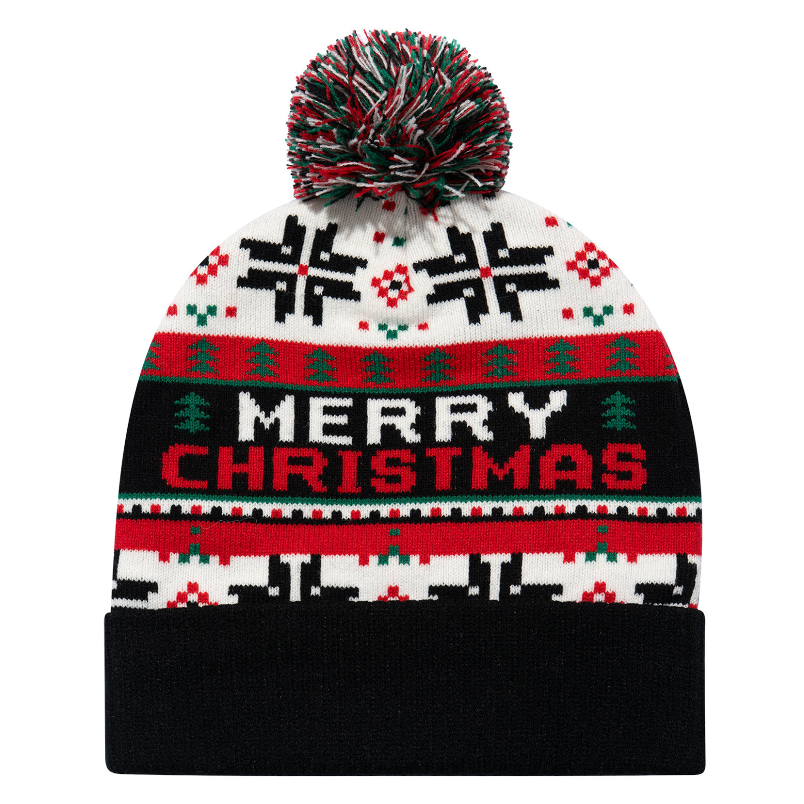 - Black men’s hat with a “Merry Christmas” inscription and a pom-pom – simple, warm and festive.