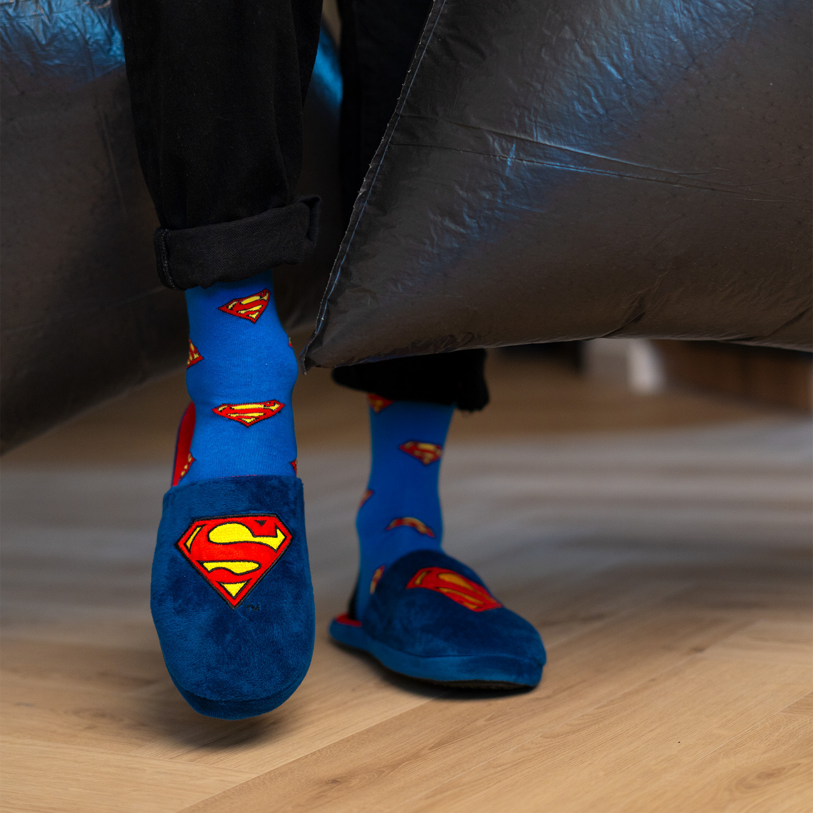 - Blaue und rote Pantoffeln mit charakteristischem "S" reichen aus und Sie werden von Ihrem Haushalt bald als "Mann aus Stahl" anerkannt.