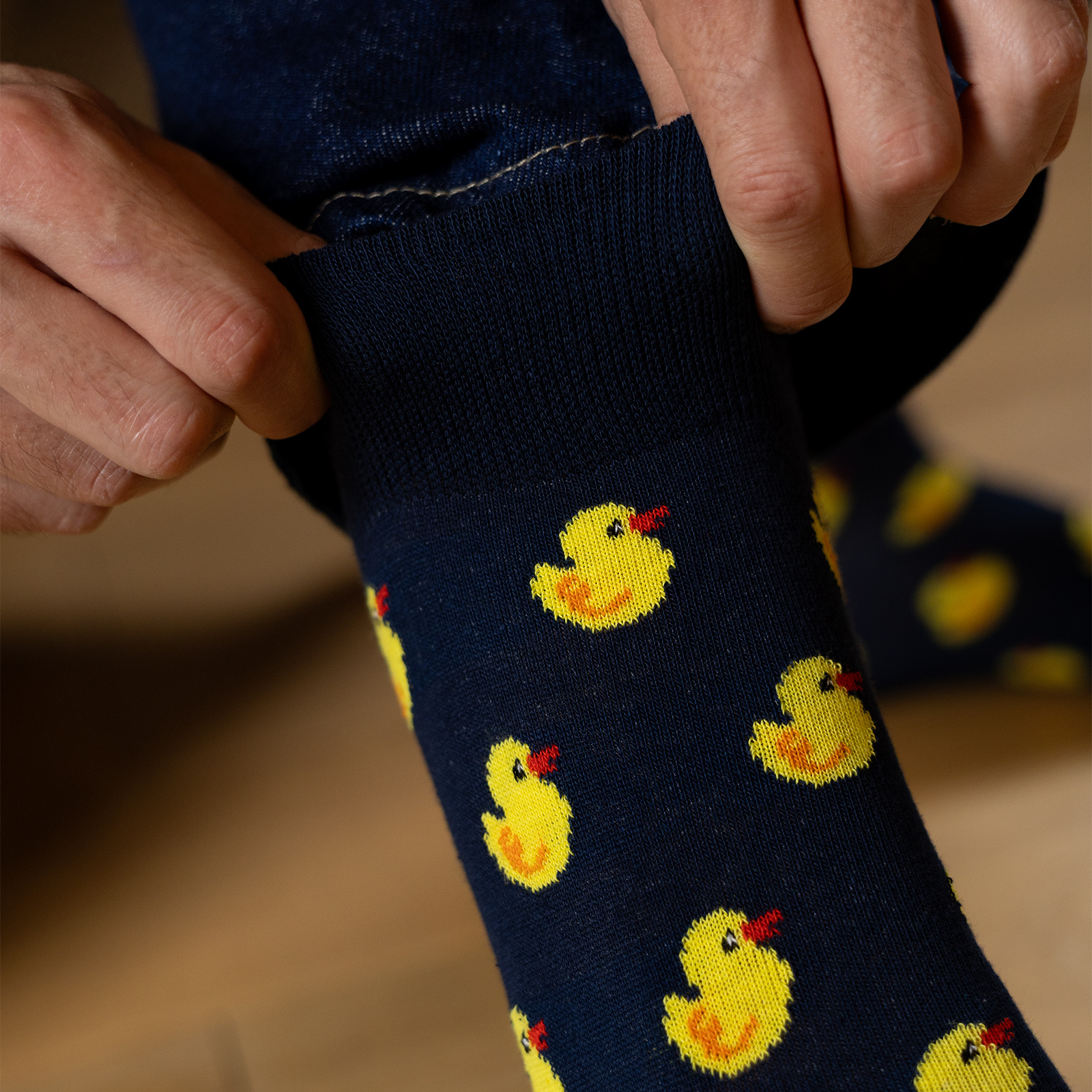 Nach der Regel: Zeig mir deine Socken und ich sage dir, wer du bist, kann man mit Sicherheit sagen, dass ein Mann in lustigen Entchensocken ein super lässiger Typ mit einer positiven Lebenseinstellung und einer gewissen Distanz zu sich selbst ist. Zweifellos hat er keine Angst, neue Wege zu beschreiten! Wer würde nicht gerne mit so einem coolen Typen befreundet sein?
