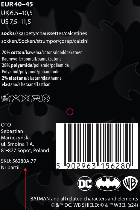 Suchen Sie ein Geschenk für einen Freund, Freund, Ehemann oder Bruder? Diese Socken sind nicht nur für eingefleischte Fans des Dark Knight ein echter Leckerbissen. Jeder Typ wird sie mögen. Außerdem besteht keine Gefahr, die Größe zu verpassen – Fledermaussocken sind in einer universellen Herrengröße 40-45 erhältlich.