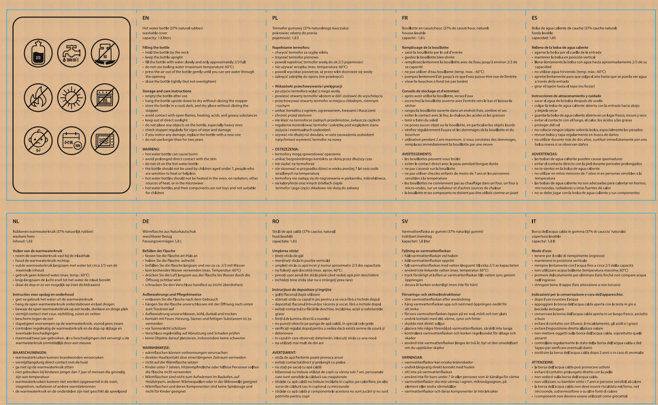 Die Wärmflasche und den Deckel regelmäßig auf Abnutzung und eventuelle Schäden überprüfen.