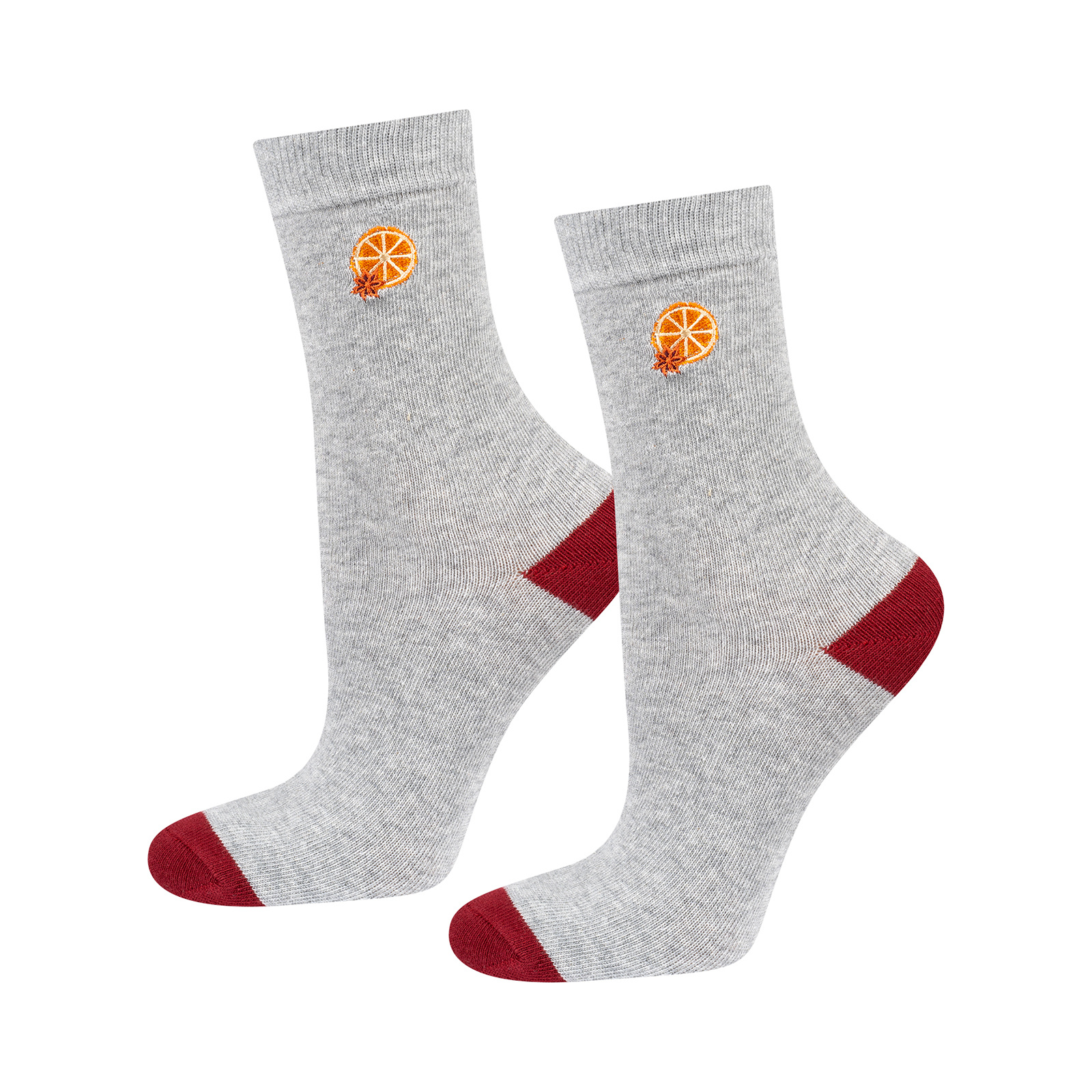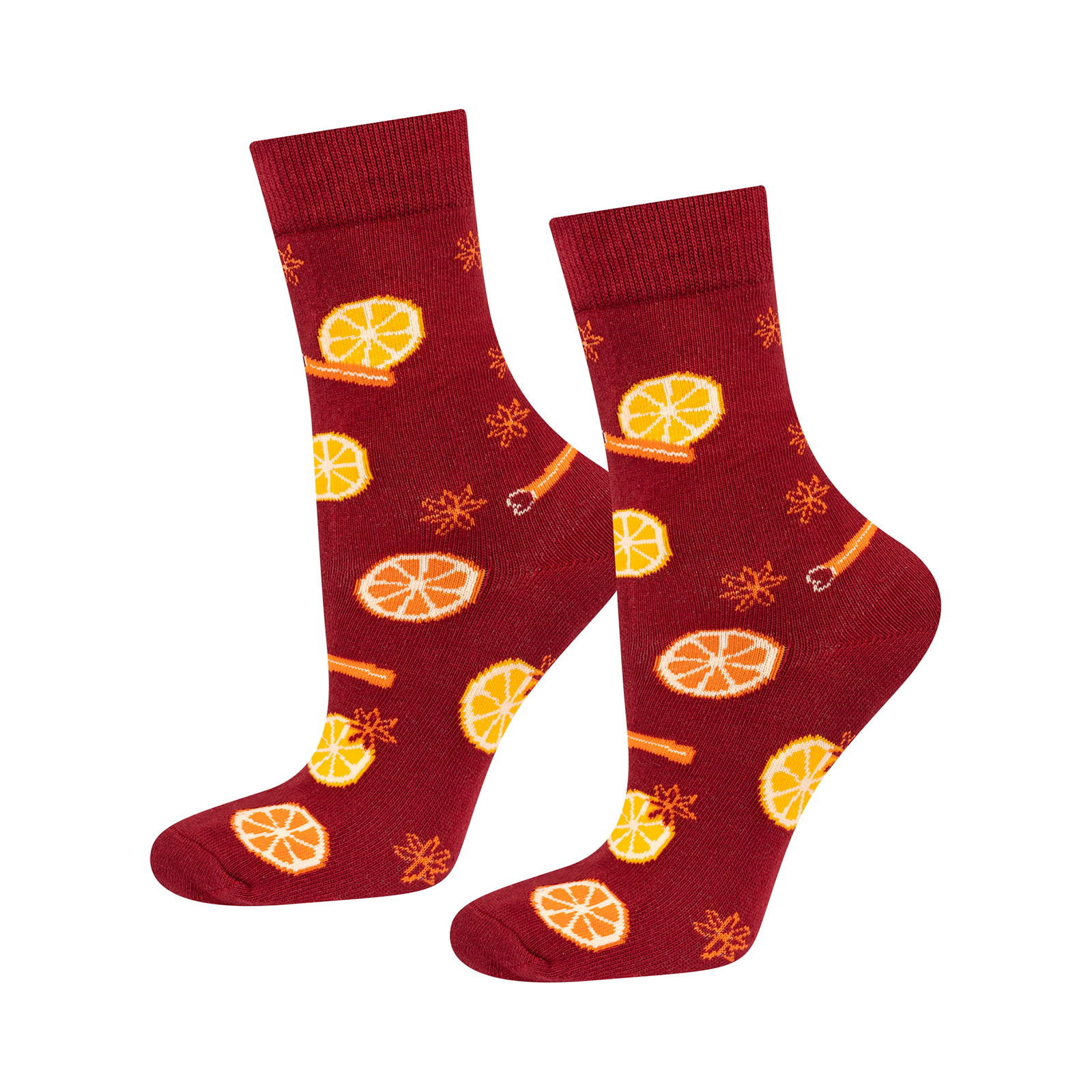 - Die Socken Grzaniec świąteczny sind ein Paar farbenfrohe rote Damensocken, die mit Motiven verziert sind, die in echtem Glühwein vorkommen: Orangen, Nelken, Anis.