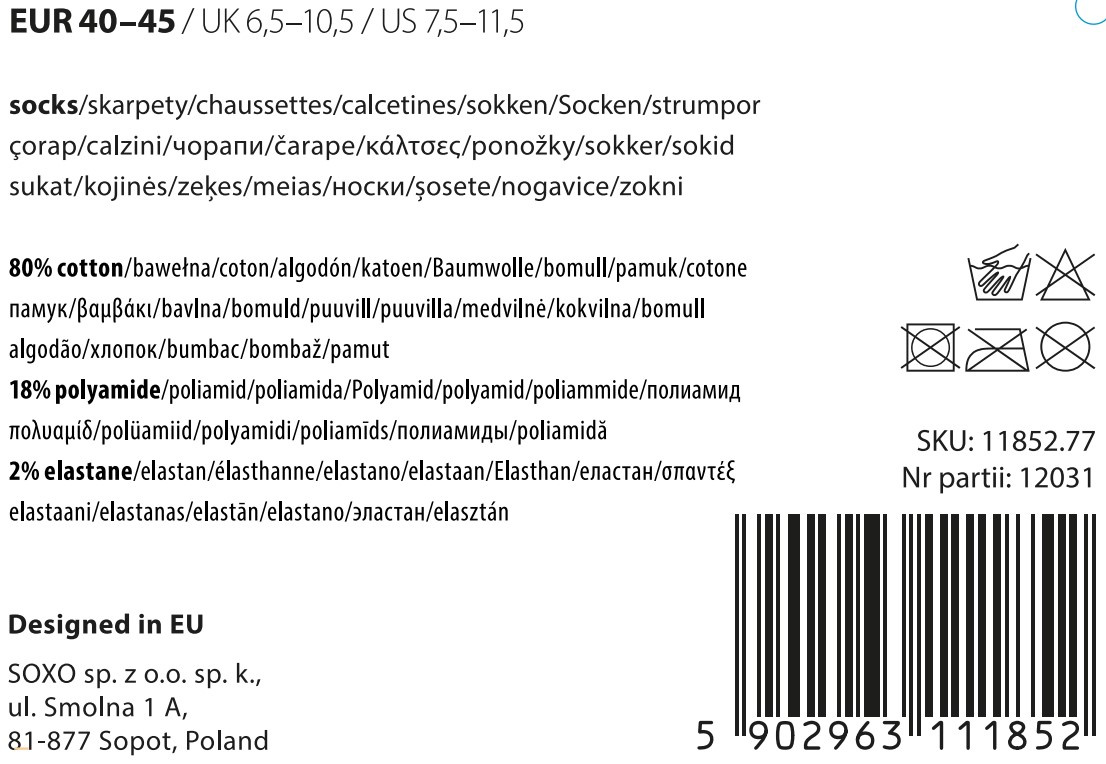 Dank des hohen Baumwollanteils in der Zusammensetzung sind die Socken atmungsaktiv und absorbieren Feuchtigkeit. Der Fuß ist trocken und die Socken gut angepasst, wodurch Ihnen den ganzen Tag über Freiheit und Wohlbefinden garantiert wird. Ausgewählte Materialien sorgen dafür, dass die Socken nicht abrutschen und den Fuß nicht zusammendrücken.