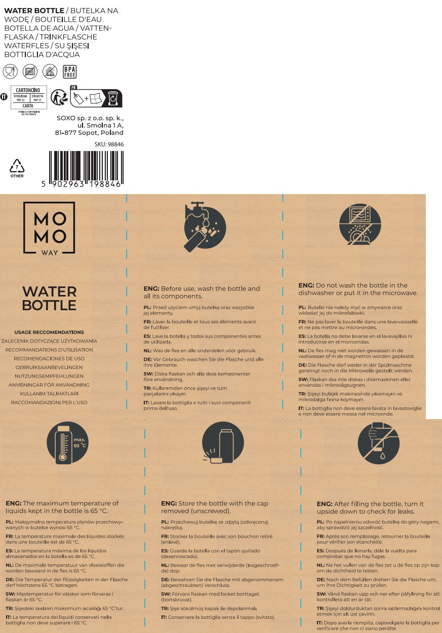 Die Flasche sollte nicht in der Spülmaschine gewaschen oder in die Mikrowelle gestellt werden. Hohe Temperaturen können zu einer Verformung des Produkts führen.
