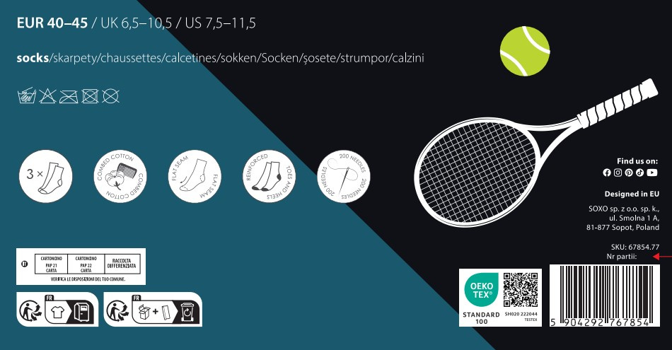 Ein Set SOXO Herrensocken mit Tennismotiv, verpackt in einer eleganten Verpackung, ist eine ideale Geschenkidee für einen Mann. Jedes der 3 Paar Socken ist mit einem anderen Muster verziert. Sie sind in dunklen Farben gehalten, was zu ihrem eleganten Look beiträgt, der auf dem Tennisplatz perfekt sein wird. Eine sensationelle Geschenkidee zum Boy's Day, Valentinstag, für Papa oder zu Weihnachten!