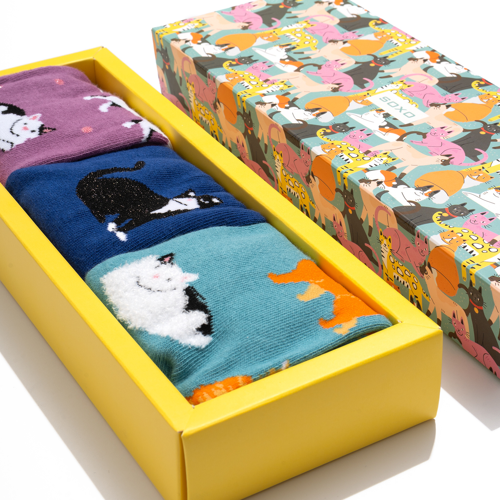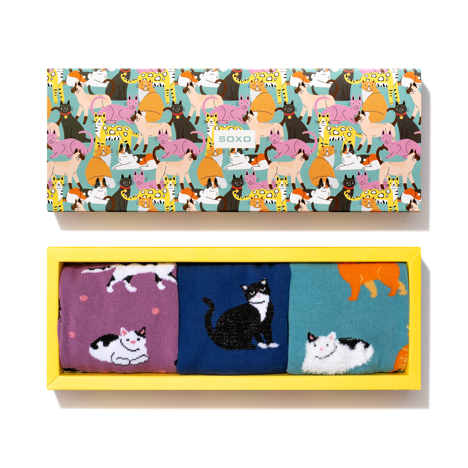3 Paare von lustigen Socken mit Katzenmotiv in einzigartiger Verpackung | Damensocken | SOXO