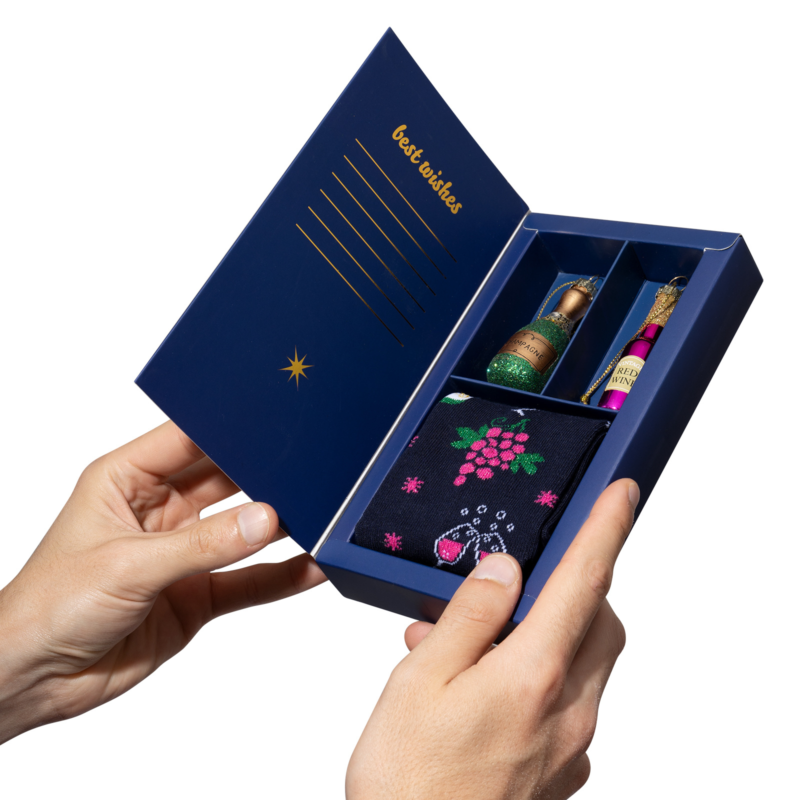 Hier ist das perfekte Set, das jede Frau begeistern wird – SOXO Damen-Socken mit Champagner-Motiv, kombiniert mit eleganten Weihnachtskugeln. Diese einzigartige Kombination vereint Funktionalität und Ästhetik und schafft ein Geschenk, das sowohl praktisch als auch wunderschön ist.