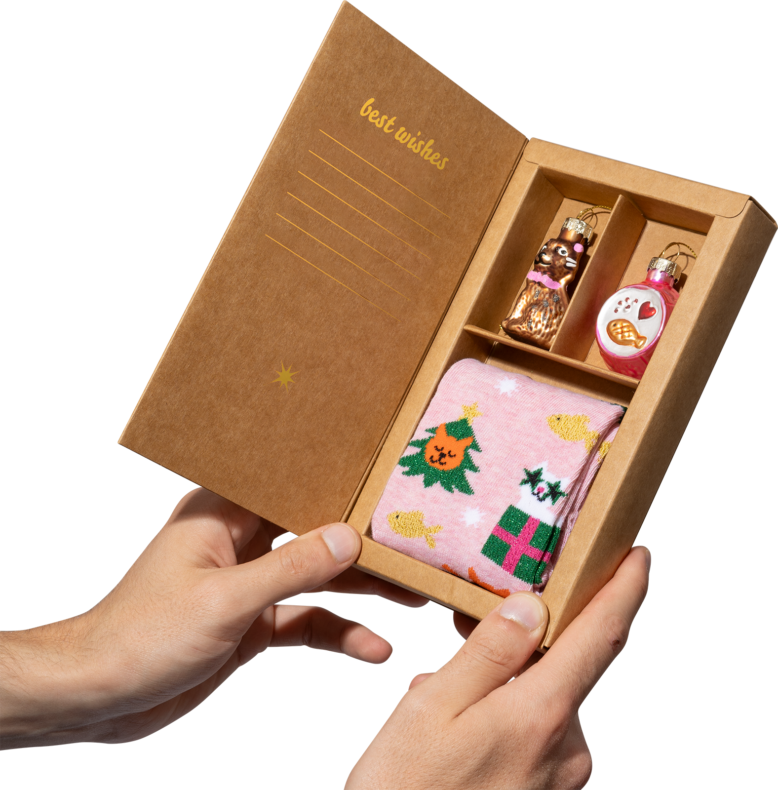 Suchen Sie ein einzigartiges Weihnachtsgeschenk für eine Frau? Hier ist die perfekte Lösung – ein Set aus niedlichen Socken mit Katzenmotiv, kombiniert mit eleganten Christbaumkugeln, verpackt in einer ästhetischen, festlichen Verpackung.