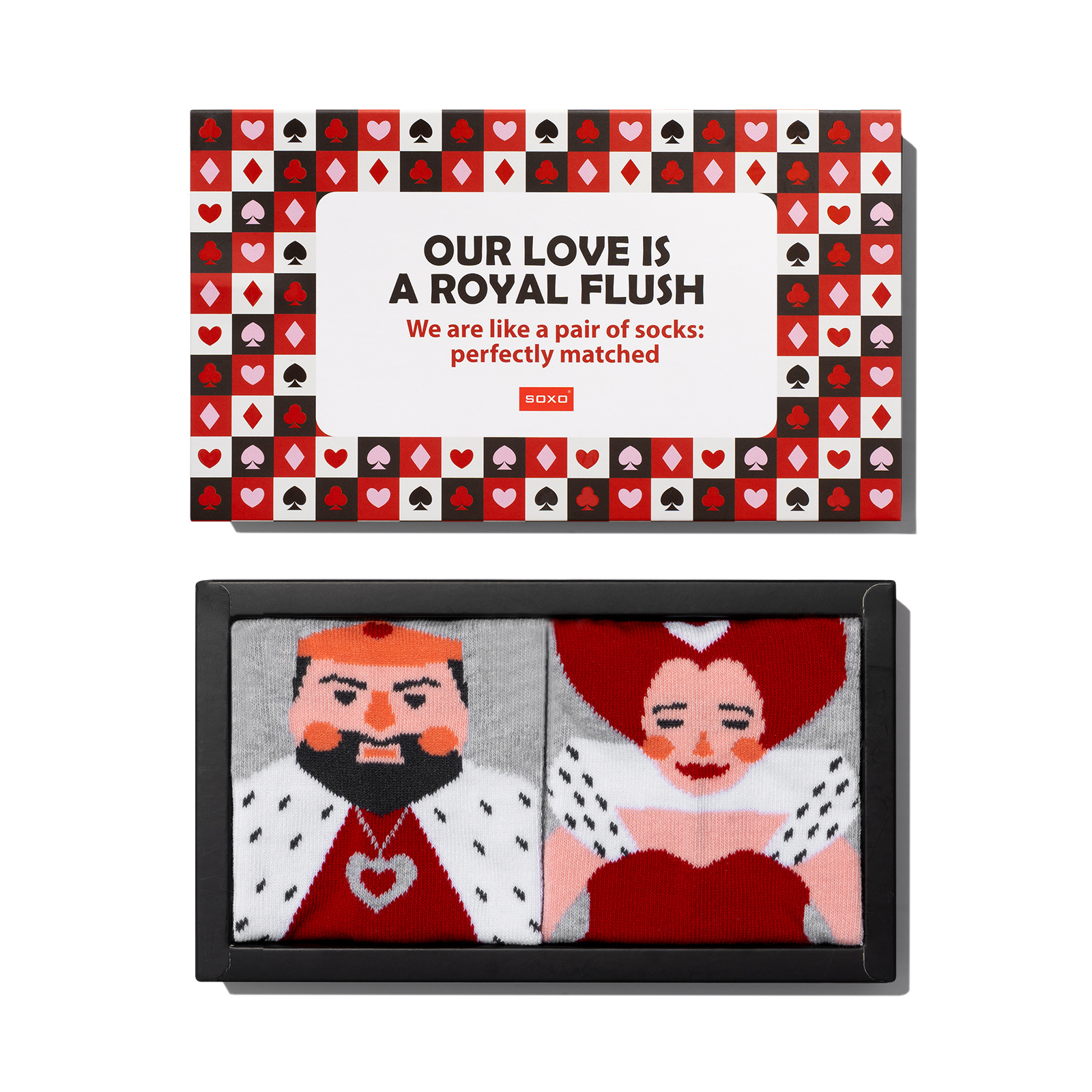 1 Paar von lustige Socken mit König und Königin Motiv in einzigartiger Verpackung zum Valentinstag | Herrensocken | SOXO