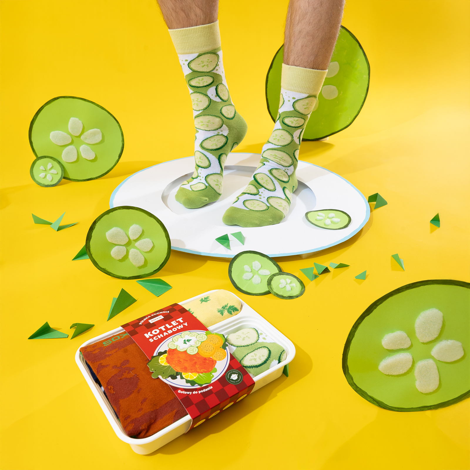 - Einzigartiges Design: Die Kombination von Schweinekotelett und Gurkensalat auf Socken ist eine kreative Möglichkeit, sich von der Masse abzuheben. Für Liebhaber klassischer polnischer Geschmäcker – ein echter Hit!