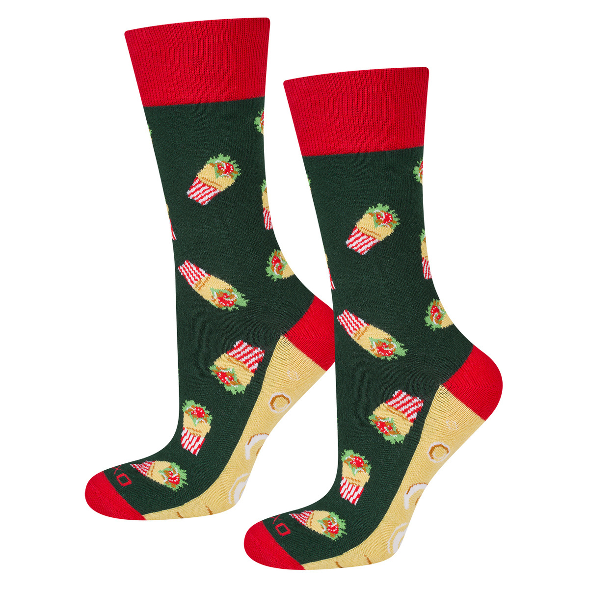Welcher Mann würde sich nicht über eine solche Hauslieferung freuen? Ein sättigender Burger, begleitet von einem saftigen Döner. Das klingt nach einer tollen Idee für ein Abendessen oder... ein Geburtstagsgeschenk für Ihren Freund oder Ehemann! Dieses appetitlich aussehende Set besteht in Wirklichkeit aus 3 Paar bunten Herrensocken!