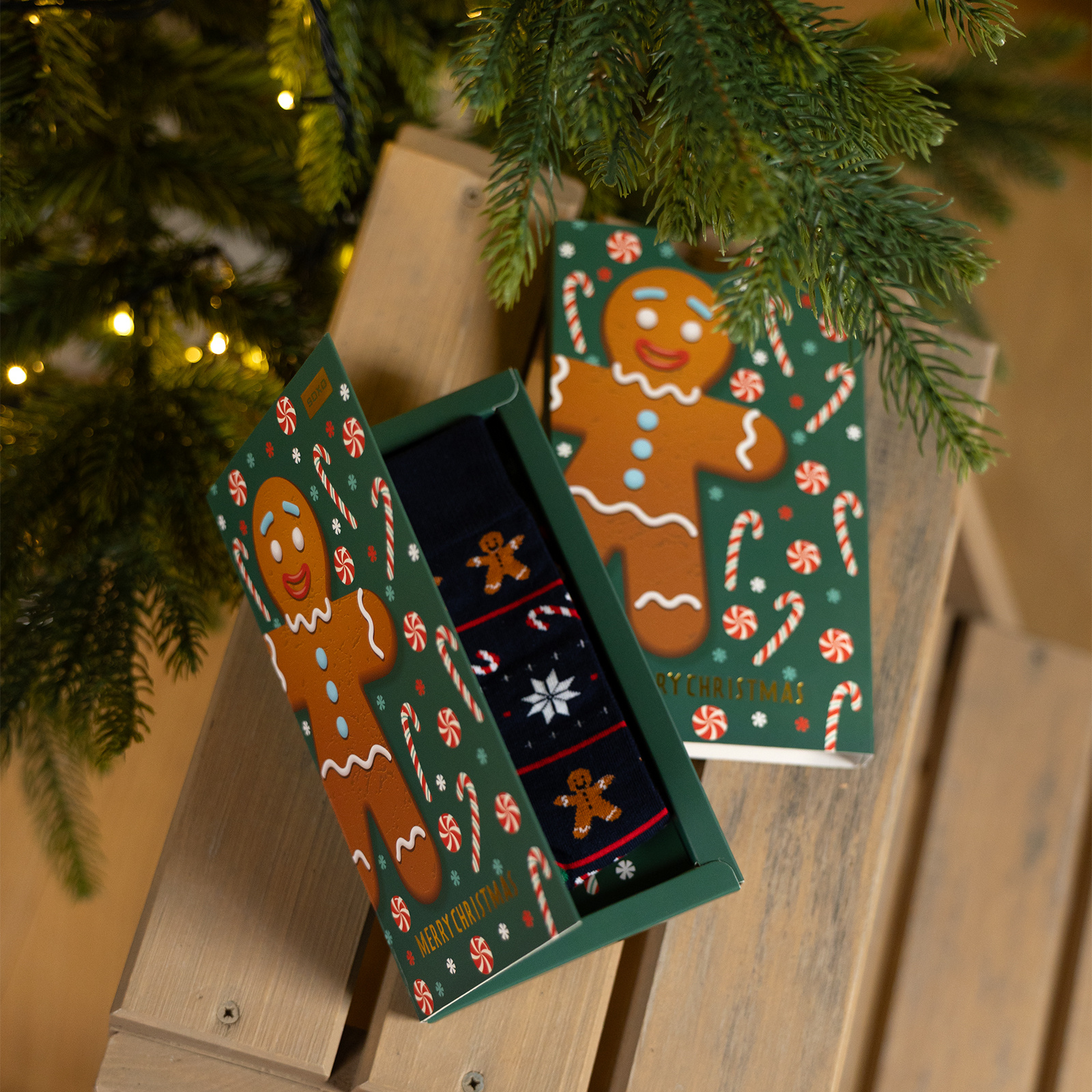 Zeit für magische Momente! Weihnachten duftet nach Gewürzen, Lichter funkeln und die Nähe der Liebsten zaubert ein Lächeln — und natürlich… Lebkuchensocken! Inspiriert von der warmen Atmosphäre der Dezemberabende, gemeinsamem Plätzchenbacken und dem Schmücken des Baumes haben wir besondere Socken mit Lebkuchenmann-, Zuckerstangen- und Sternmotiven entworfen. Alles verpackt in einer Geschenkbox, die wie eine liebevoll gestaltete Grußkarte aussieht — perfekt zum Verschenken.