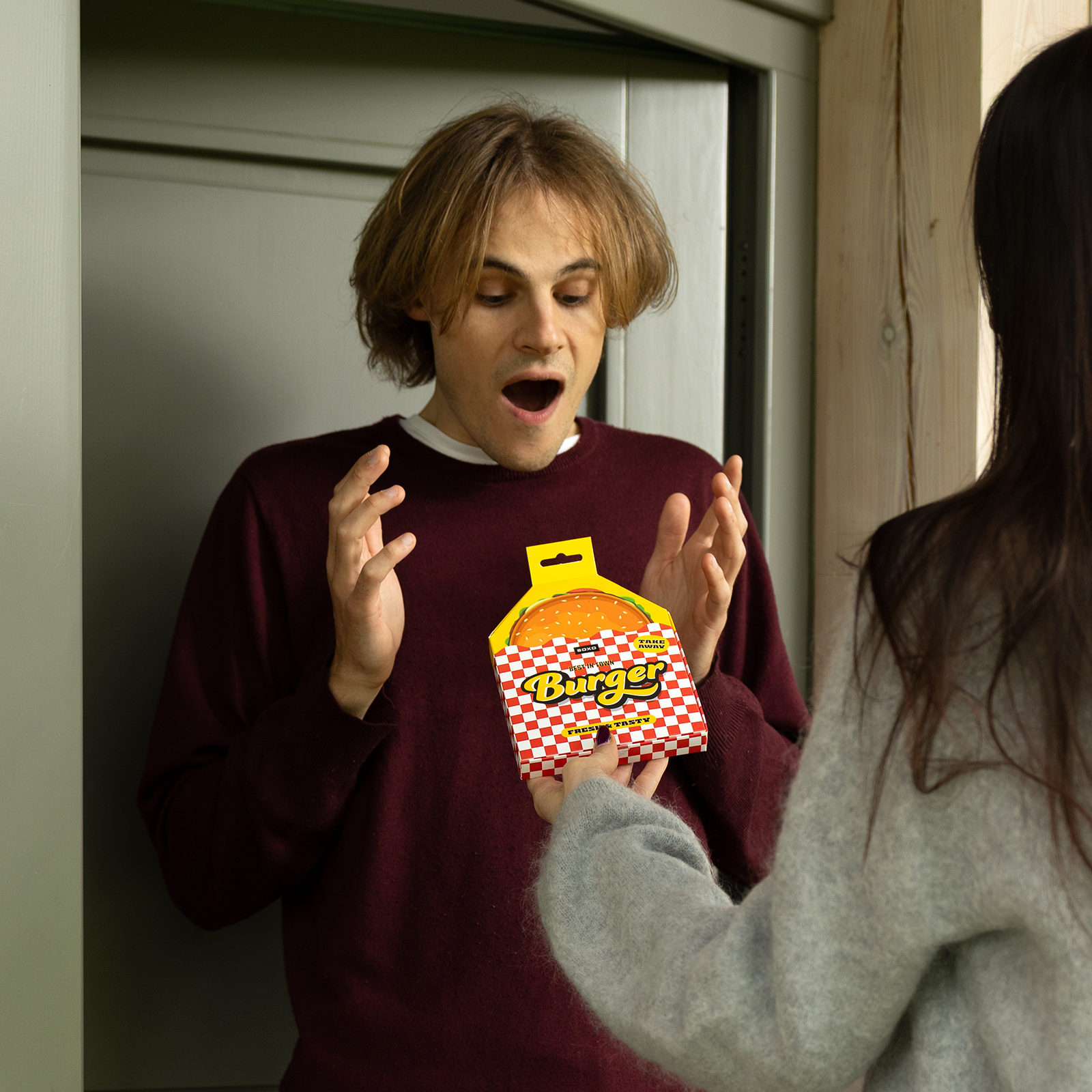 - Herrensocken mit Burger-Motiv, verpackt in einer Schachtel im klassischen Fast-Food-Stil – eine lustige und originelle Geschenkidee für alle, die gutes Essen und außergewöhnliche Accessoires lieben.