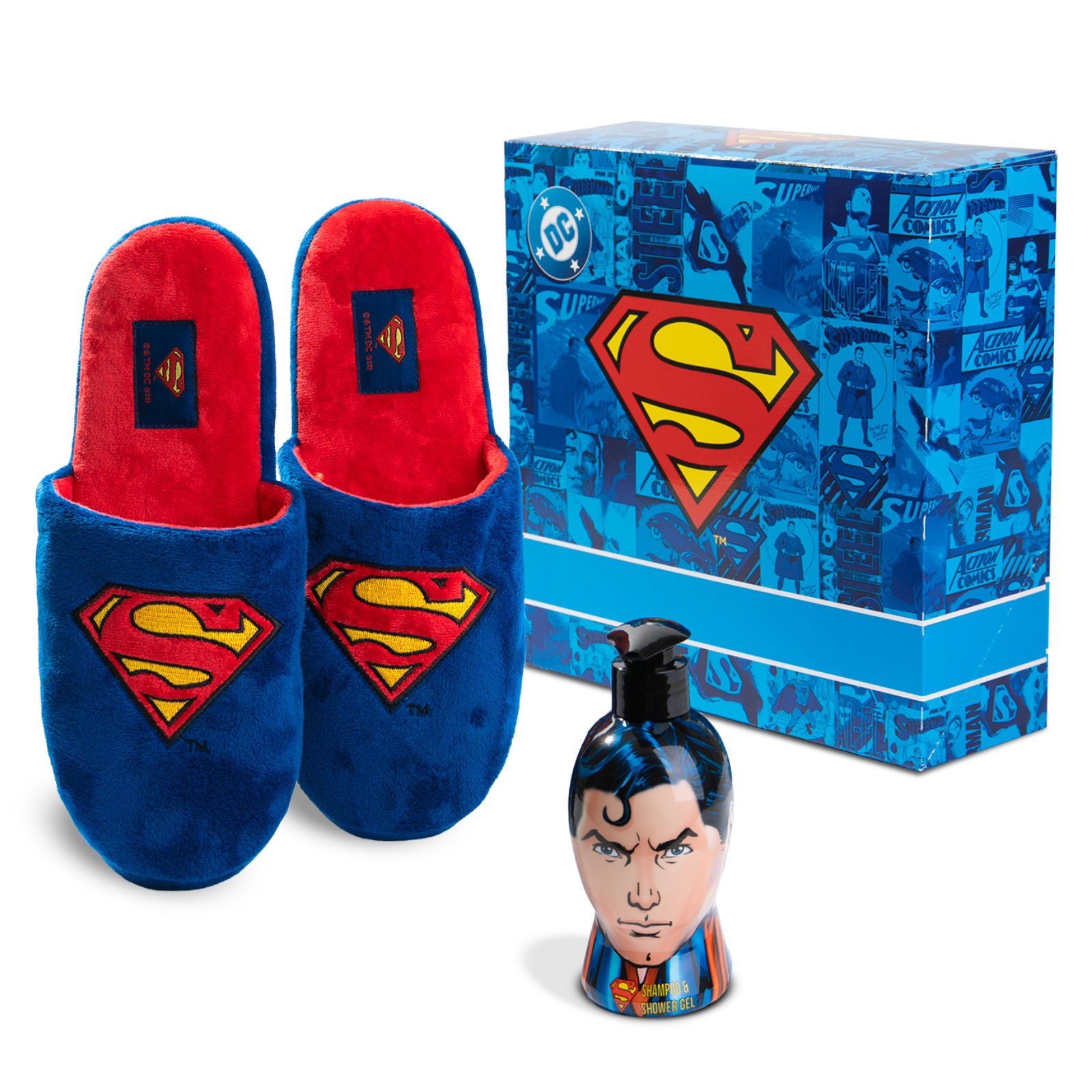 - Set für einen echten Superhelden: weiche Superman-Hausschuhe sowie 2-in-1 Duschgel und Shampoo. Elegant verpackt in einer beeindruckenden Geschenkbox – ideal für Fans der DC-Comics.