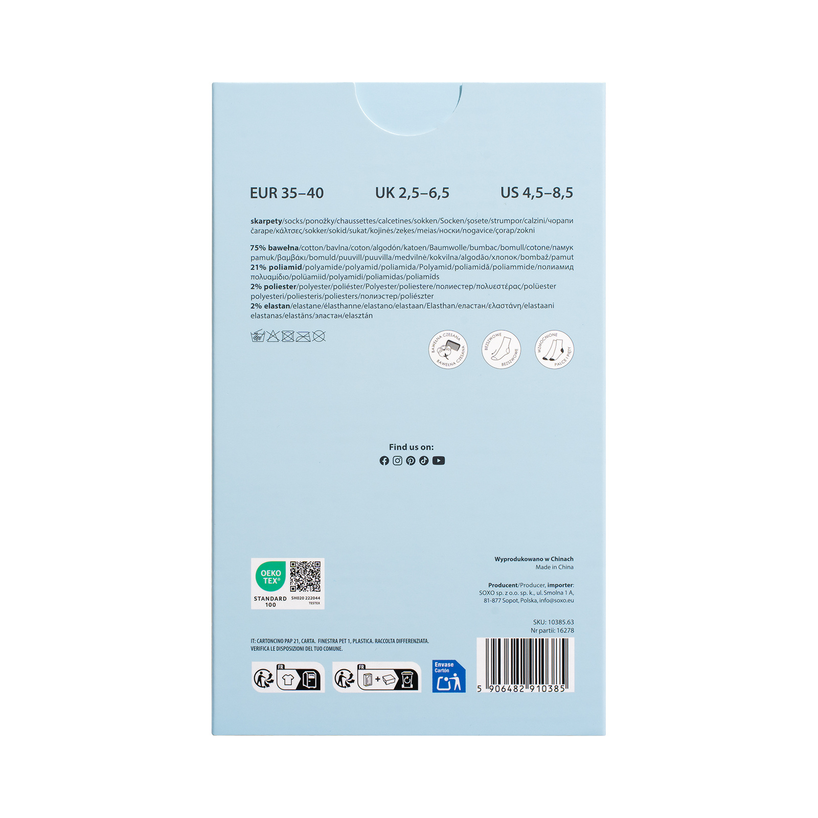 Dank des hohen Baumwollanteils in der Zusammensetzung sind die Socken atmungsaktiv und absorbieren Feuchtigkeit. Der Fuß ist trocken und die Socken gut angepasst, wodurch Ihnen den ganzen Tag über Freiheit und Wohlbefinden garantiert wird. Ausgewählte Materialien sorgen dafür, dass die Socken nicht abrutschen und den Fuß nicht zusammendrücken.