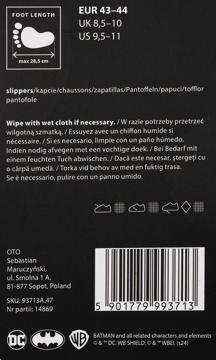 - Nie zapomnij tylko, że noc jest najciemniejsza tuż przed świtem. A świt już niedługo… Kapcie męskie dla Batmanów incognito wyposażono w twardą, elastyczną podeszwę z tworzywa TPR, która doskonale izoluje stopy od podłoża, jednocześnie zapobiegając ślizganiu.