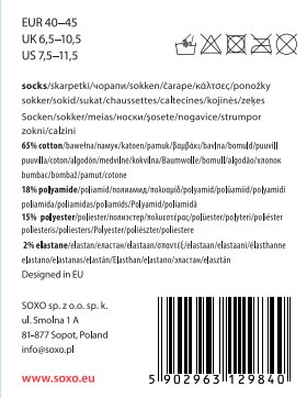 Kolorowych skarpetek SOXO z pewnością nie można przeoczyć, bo niesamowite wzory sprawiają, że każda kreacja ma swoistą niepowtarzalność i różnorodność. Noś je do spodni, do pracy, szkoły lub na imprezę i ciesz się życiem. Niezwykle wyjątkowe skarpetki dla wyjątkowych osób.