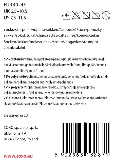 Kolorowych skarpetek SOXO z pewnością nie można przeoczyć, bo niesamowite wzory sprawiają, że każda kreacja ma swoistą niepowtarzalność i różnorodność. Noś je do spodni, do pracy, szkoły lub na imprezę i ciesz się życiem. Niezwykle wyjątkowe skarpetki dla wyjątkowych osób.