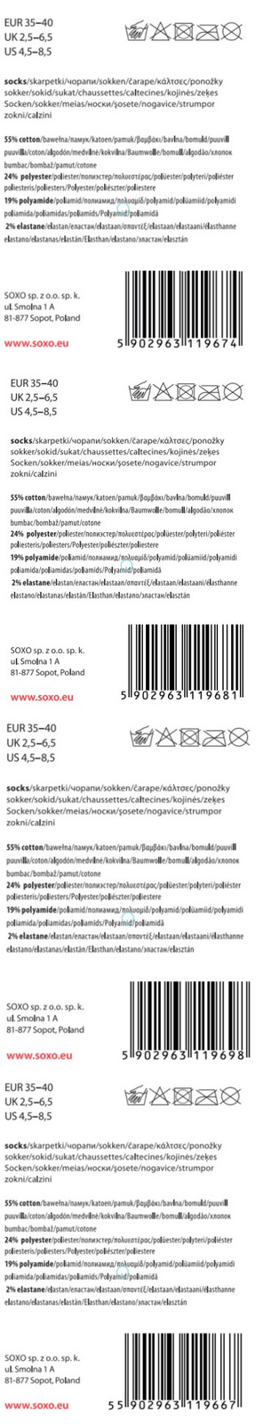 Kolorowych skarpetek SOXO z pewnością nie można przeoczyć, bo niesamowite wzory sprawiają, że każda kreacja ma swoistą niepowtarzalność i różnorodność. Noś je do spodni, do pracy, szkoły lub na imprezę i ciesz się życiem. Niezwykle wyjątkowe skarpetki dla wyjątkowych osób.