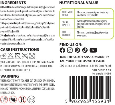 Kolorowych skarpetek SOXO z pewnością nie można przeoczyć, bo niesamowite wzory sprawiają, że każda kreacja ma swoistą niepowtarzalność i różnorodność. Noś je do spodni, do pracy, szkoły lub na imprezę i ciesz się życiem. Niezwykle wyjątkowe skarpetki dla wyjątkowych osób.