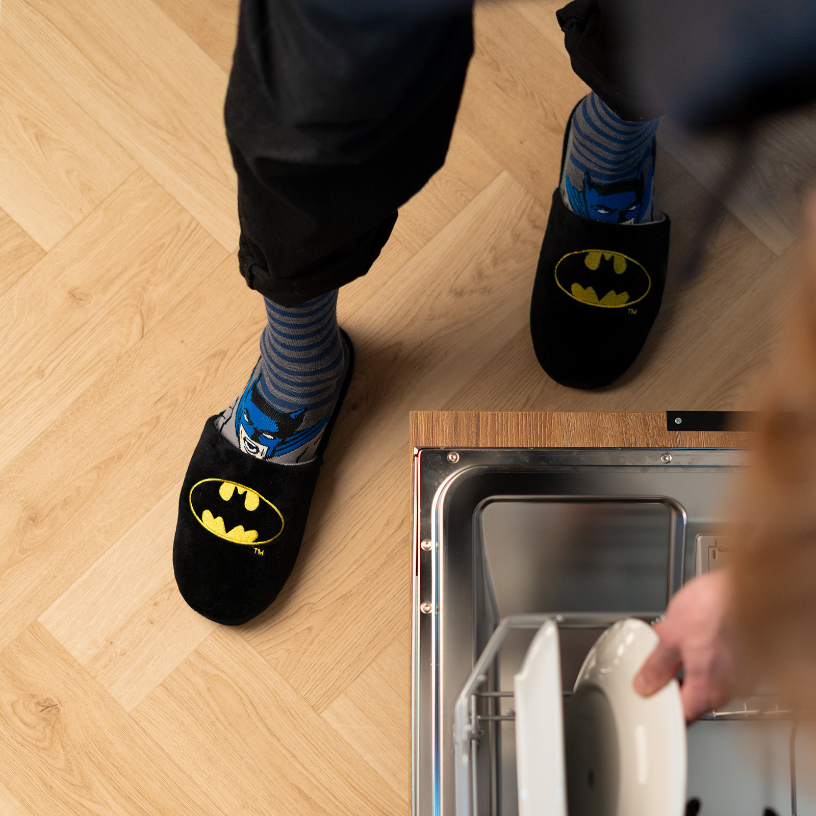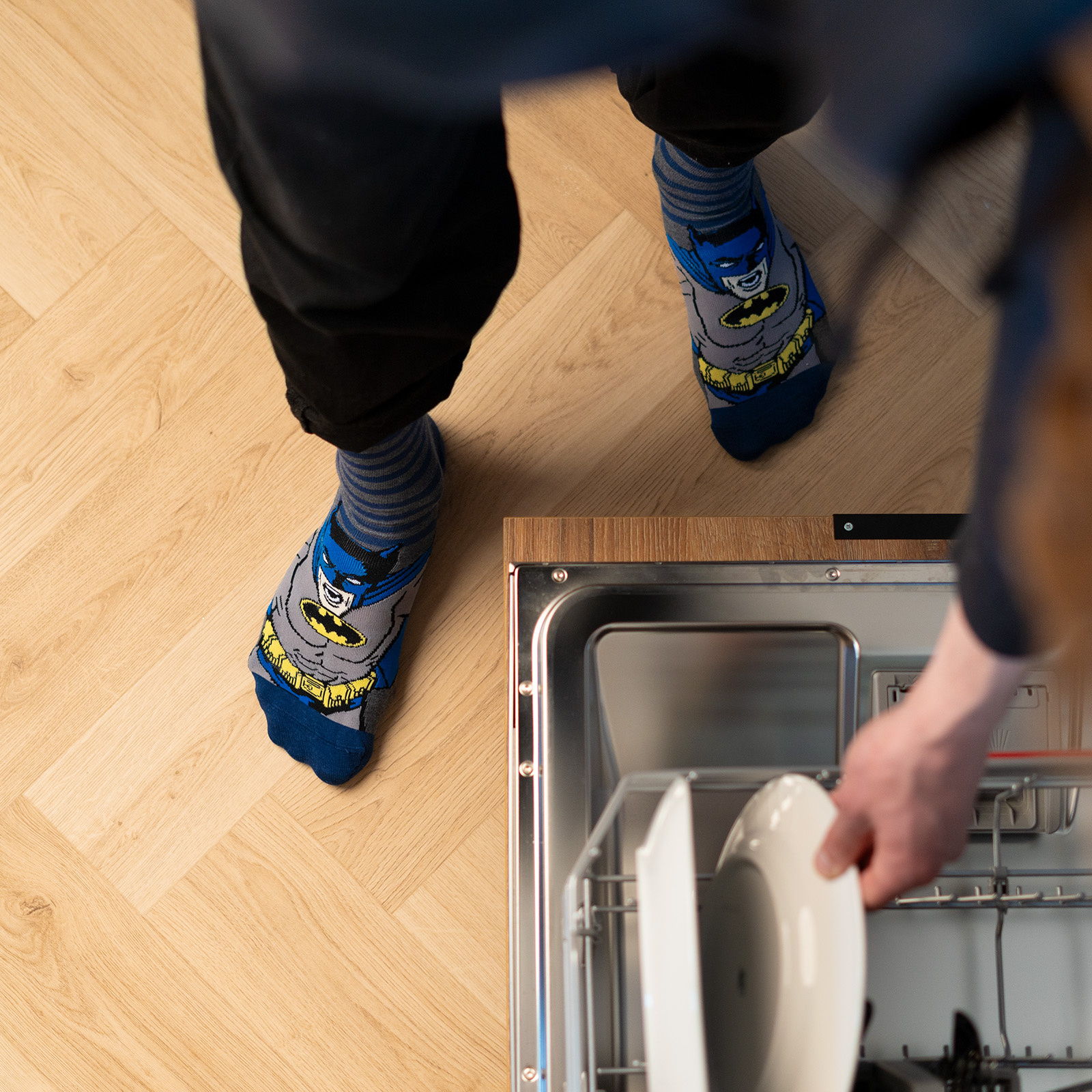 - Ciemna kolorystyka – szaro- czarne paski w połączeniu z wizerunkiem Człowieka Nietoperza sprawiają, że Batskarpety pasują do każdego stroju. Załóż je do szkoły, pracy, na spacer, spotkanie z kolegami czy randkę – wszędzie poczujesz się jak superbohater.