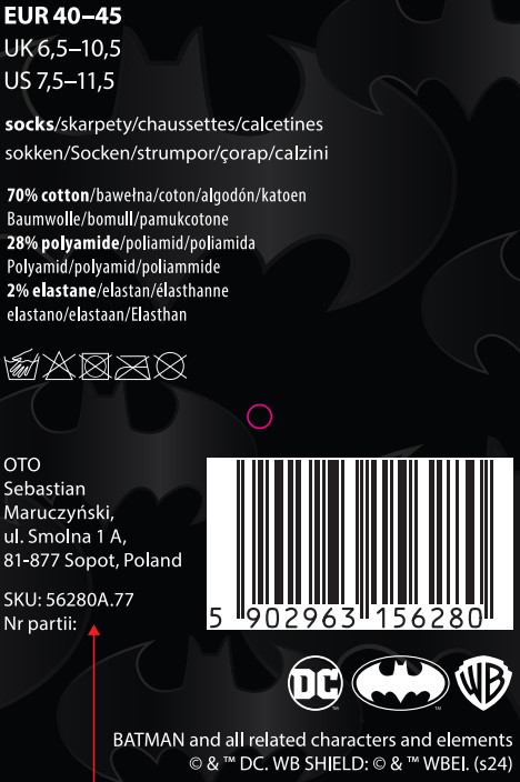 - Produkt wykonano z najwyższej jakości bawełny, dzięki czemu stopy nie pocą się i mogą oddychać nawet podczas najbardziej intensywnych walk z Jokerem.