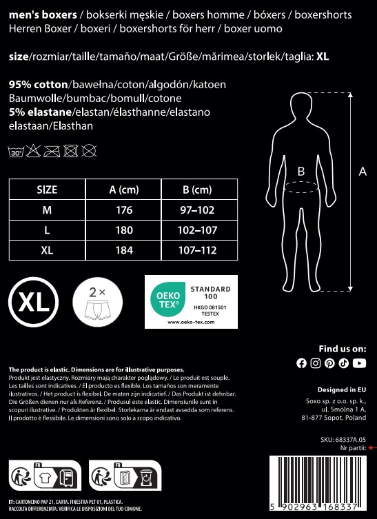 - Bielizna od SOXO to bokserki z najwyższej jakości bawełny z dodatkiem elastanu, dzięki czemu są maksymalnie wygodne, świetnie się noszą i doskonale dopasowują się do ciała.