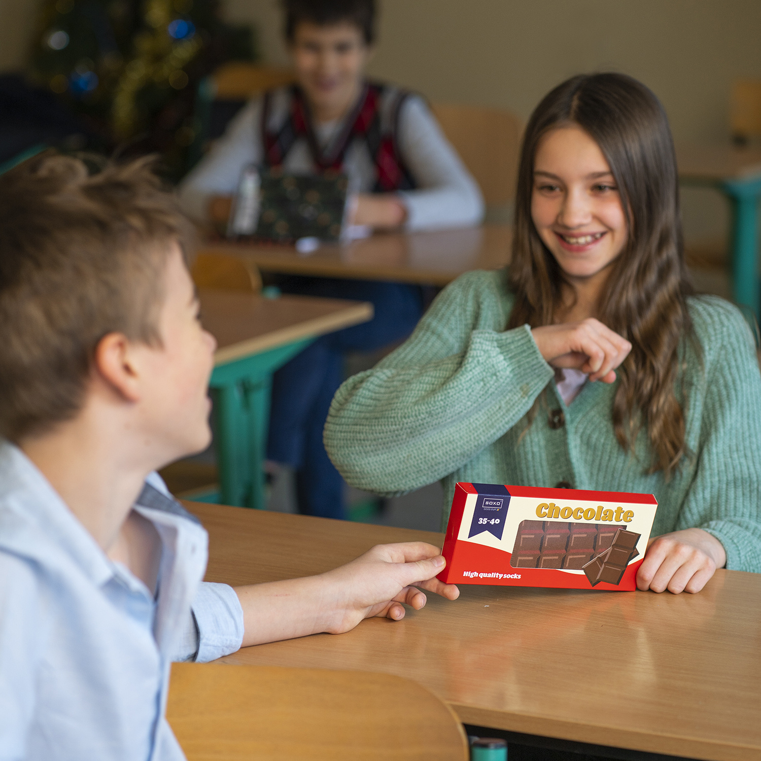 Szukasz prezentu dla dziewczyny, mamy, siostry, męża, który będzie inny niż wszystkie dotychczasowe? Chcesz, aby był on oryginalny, niecodzienny i wyjątkowy? To dobrze trafiłeś! Nasza propozycja skarpet z motywem tabliczki czekolady to na pewno duże zaskoczenie dla przyszłej właścicielki. Wybierz dla Niej skarpetki zapakowane w oryginalne pudełko imitujące opakowanie czekolady. Niecodzienny wzór skarpetek to radość i wygoda każdego dnia.