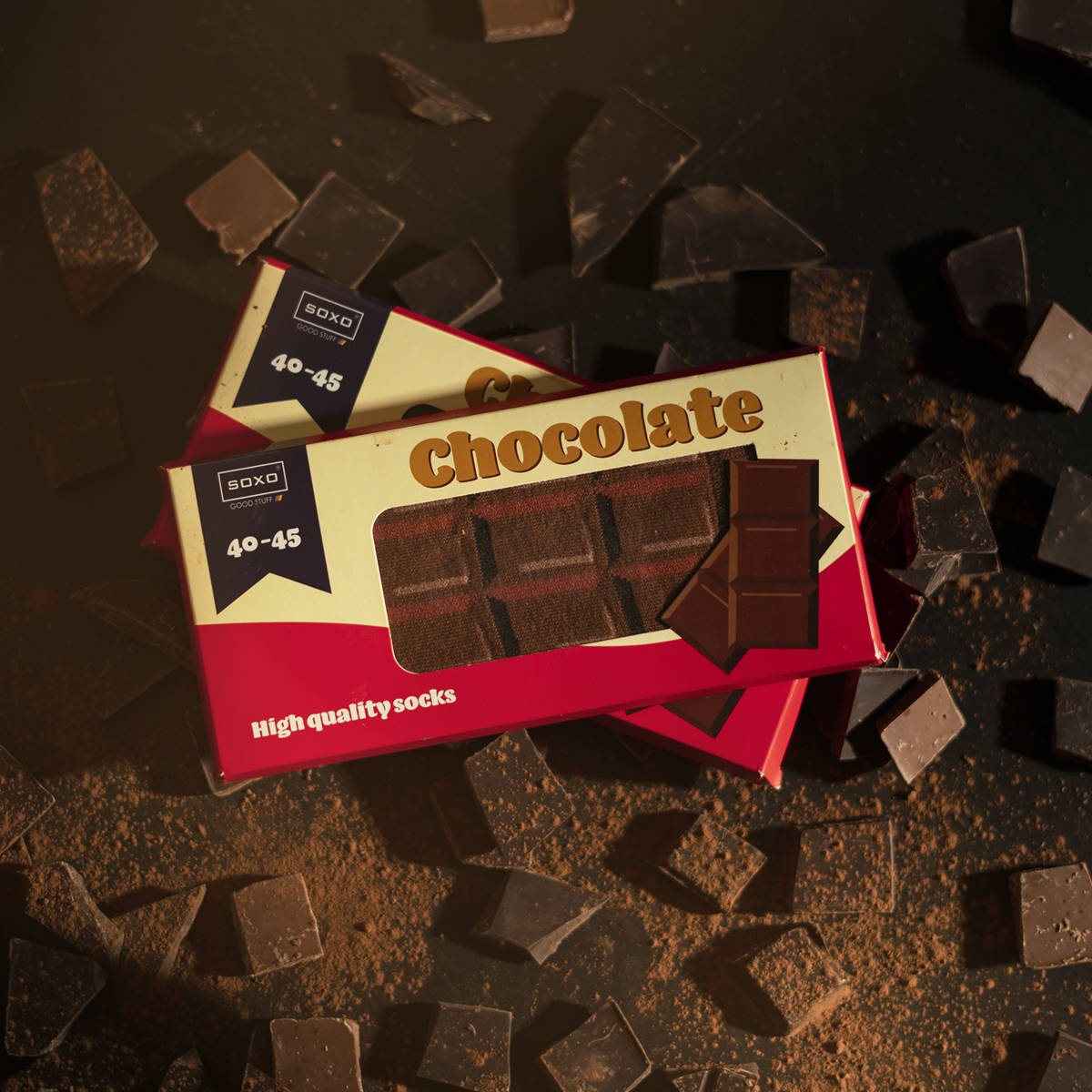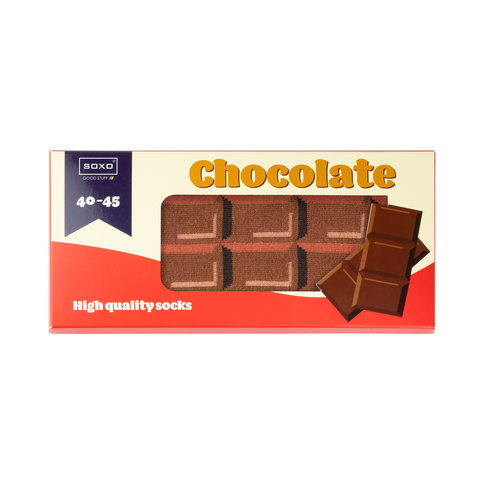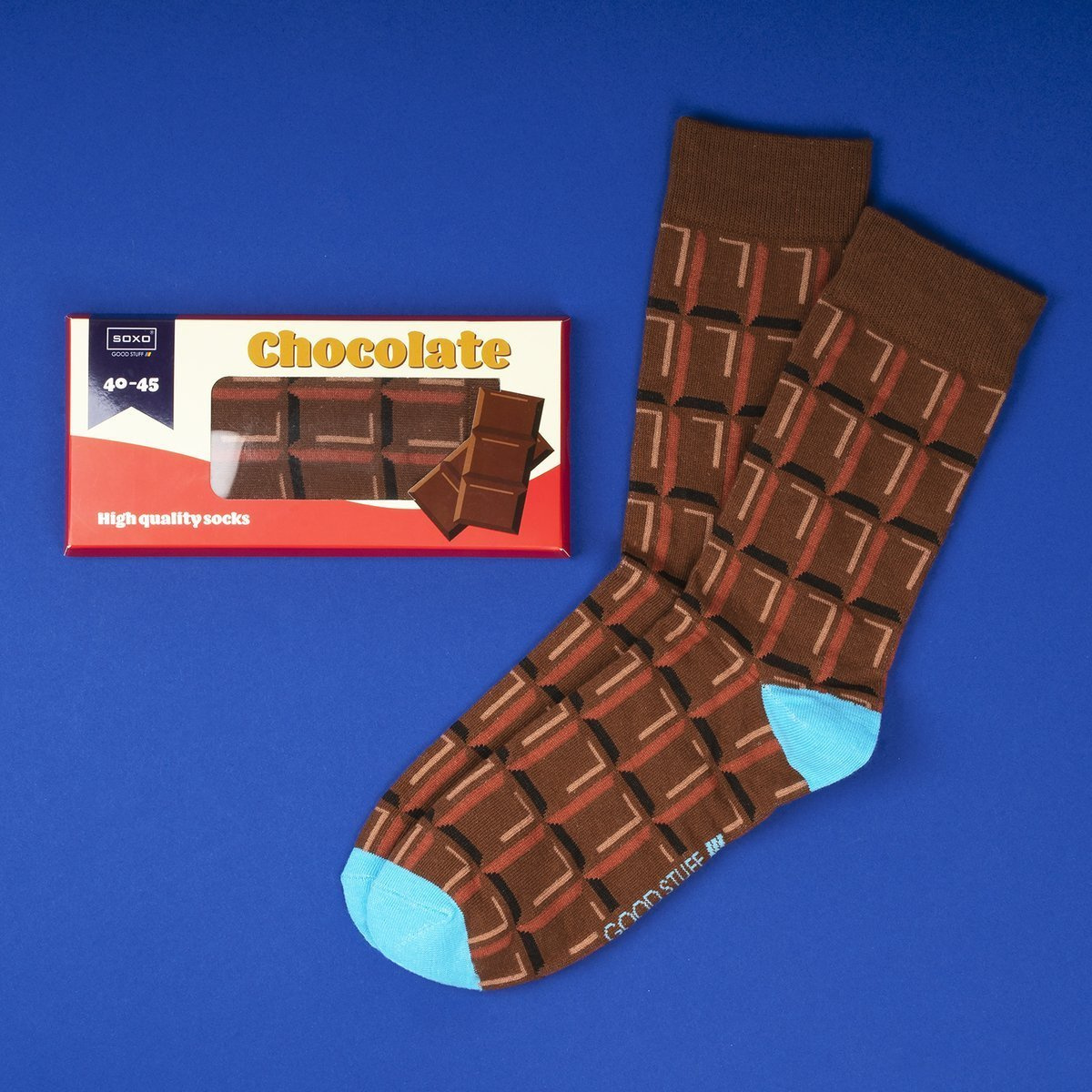 - Skarpetki ze wzorem w apetyczne kostki czekolady są zapakowane w kartonik wyglądający jak od prawdziwej czekolady. Dzięki temu stają się nieoczywistym podarunkiem, który sprawi wiele radości po rozpakowaniu. Skarpetki ucieszą równie mocno co prawdziwa czekolada, z tym wyjątkiem, że czekolada kiedyś się kończy, a nasze skarpetki posłużą przez długi, długi czas!