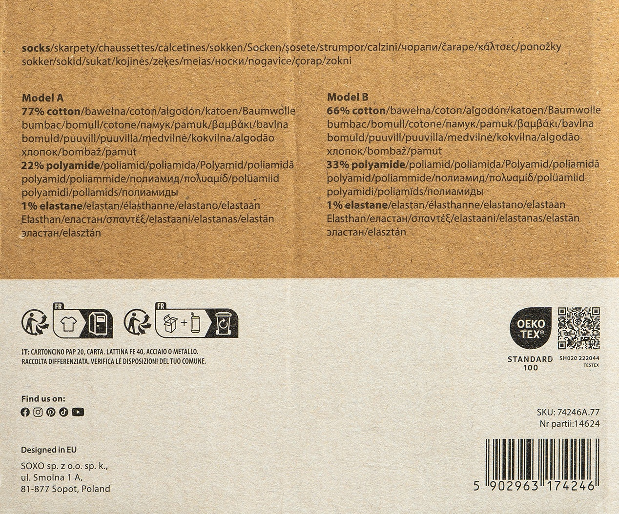 - Modne skarpetki SOXO z pewnością ucieszą wszystkich Panów lubiących nosić kolorowe skarpetki w modne, ciekawe wzory.