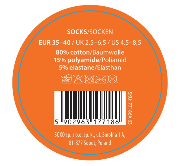 Kolorowych skarpetek SOXO z pewnością nie można przeoczyć, bo niesamowite wzory sprawiają, że każda kreacja ma swoistą niepowtarzalność i różnorodność. Noś je do spodni, do pracy, szkoły lub na imprezę i ciesz się życiem. Niezwykle wyjątkowe skarpetki dla wyjątkowych osób.