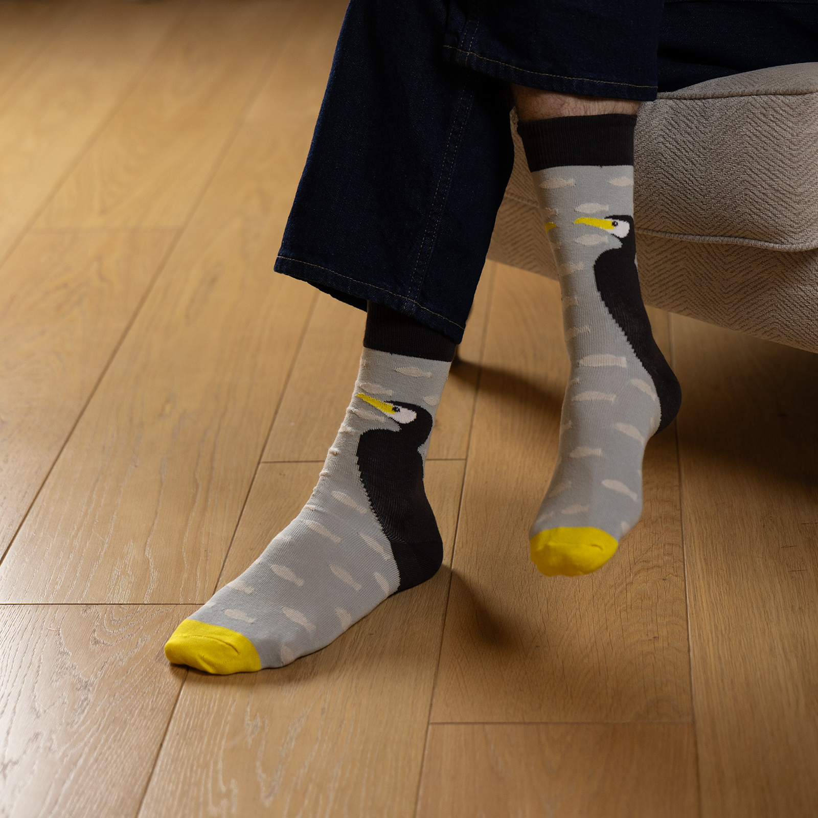 - Zabawne skarpetki z kormoranem są w jasnych, stonowanych kolorach. Dzięki temu, postać kormorana jest wyrazista.