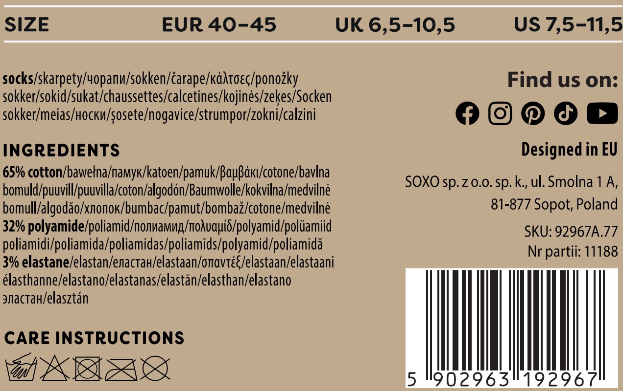 - Codzienna stylizacja ze skarpetami SOXO nie musi być nudna! Zabawne wzory świetnie sprawdzą się do każdej stylizacji. Noś skarpetki, gdzie tylko chcesz. Wysokiej jakości bawełna zapewnia wygodę każdego dnia. Zrób sobie prezent i ciesz się dobrym wyborem!