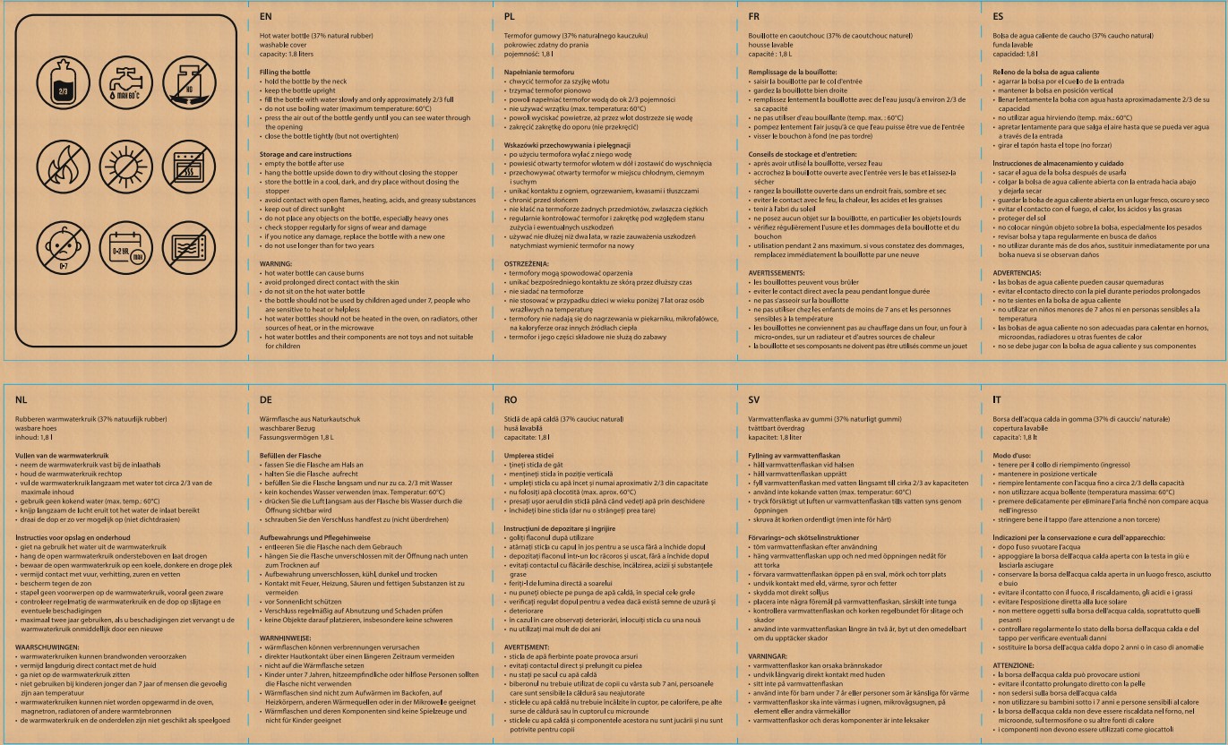 Każdy doceni jego możliwości! Lubisz tworzyć przytulny nastrój? Napełnij ciepłą wodą pluszowy termofor i zrelaksuj się dzięki jego ciepłu. Rozgrzeje Cię w chłodne wieczory, ogrzeje zimne stopy, pomoże poczuć się jak w domu w obcym miejscu. Jego ciepło ukoi ból w naturalny sposób. Przyda się przy bólach kręgosłupa, karku, bólach menstruacyjnych itp. Można przy jego pomocy zrobić zimne okłady np. podczas migreny. Termofor jest duży: 1.8 l, dzięki czemu woda w nim szybko nie wystygnie i może objąć nawet większą część ciała.