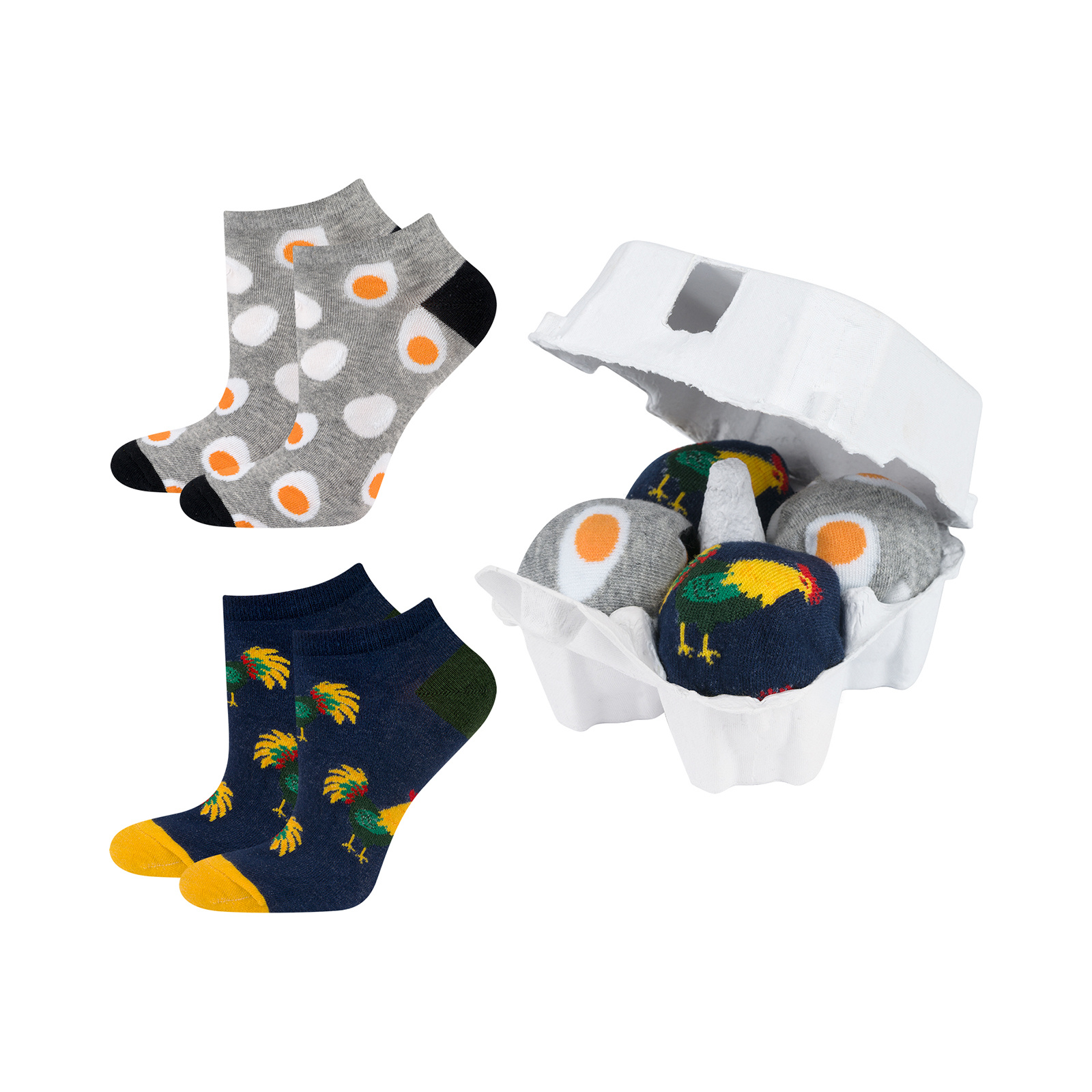 Wesołe skarpetki z motywem koguta i jajka to idealne rozwiązanie dla mężczyzn z poczuciem humoru i nie tylko! Sprawdzą się do każdej stylizacji. Wybierz dwu pak skarpetek umieszczony w eleganckie opakowanie imitujące wytłaczankę do jajek i zrób śmieszny prezent!
