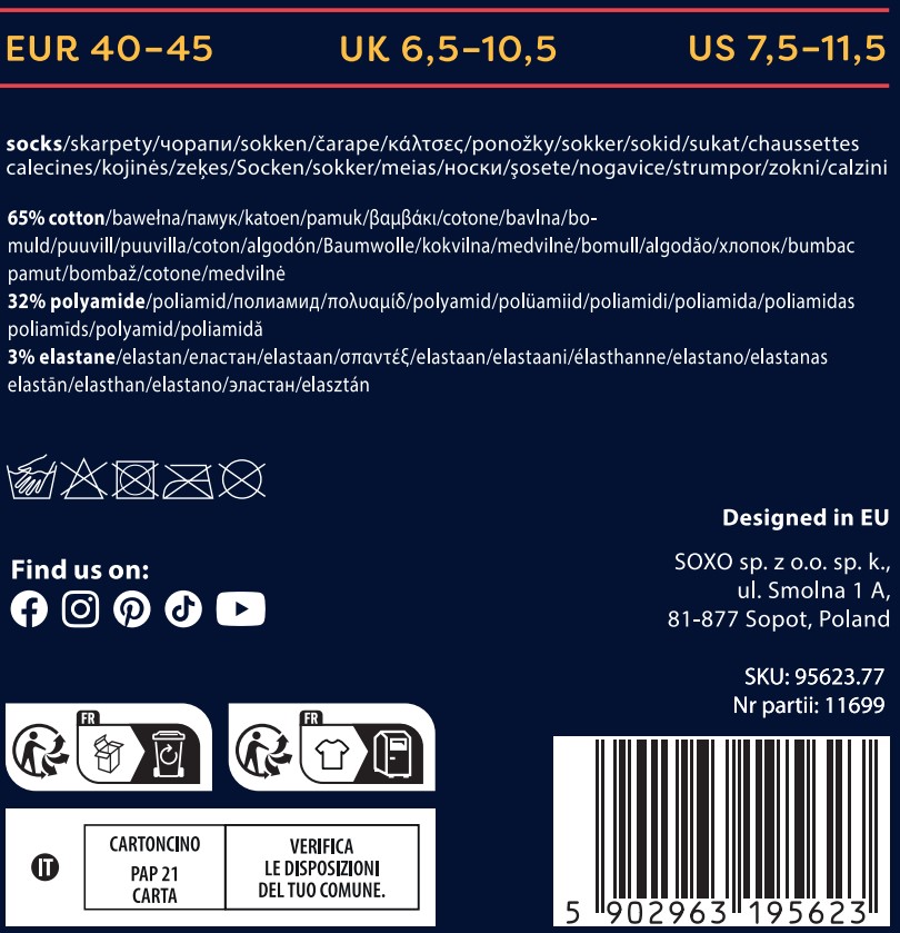 - Skarpetki SOXO zawrócą Ci w głowie! To co je wyróżnia to żywe kolory, ciekawe wzory i niesamowita wygoda, za którą odpowiada najwyższej jakości materiał! Wyrażaj swój styl i nastrój kolorowymi skarpetkami i czuj radość każdego dnia!