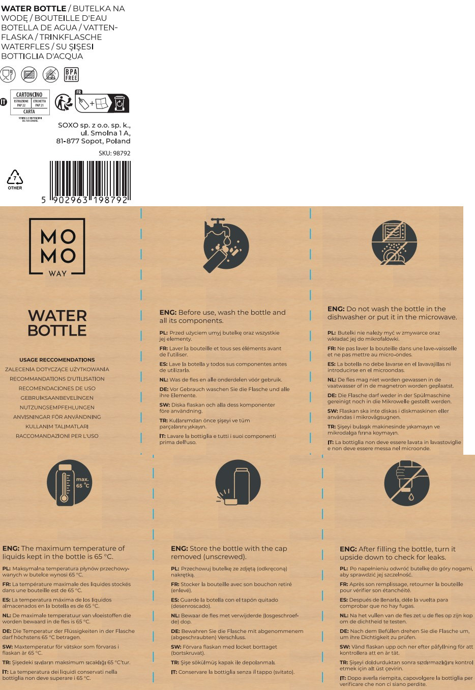 - Butelka MOMO WAY wykonana z tritanu charakteryzuje się nadzwyczajną wytrzymałością, przypominającą cechy szkła. Tak jak butelki szklane, nie wchłania zapachów przechowywanych płynów, jest odporna na niskie i wysokie temperatury oraz nadaje się do mycia w zmywarce.
