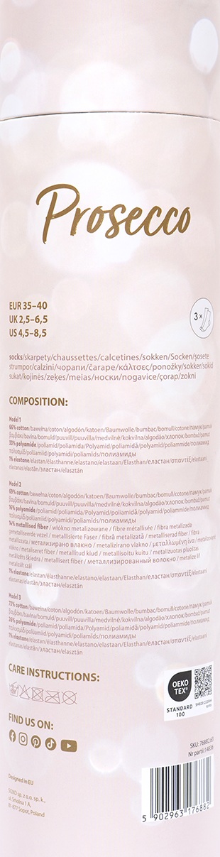 Piękne skarpetki są zapakowane w niecodzienne opakowanie, które do złudzenia przypomina oryginalny produkt. Butelka Prosecco kryje w sobie, aż dwie pary skarpet! Ich wygląd z pewnością zaskoczy przyszła właścicielkę. Noś je do pracy, szkoły, na spotkanie ze znajomymi, randkę lub zabierz je na wakacje.