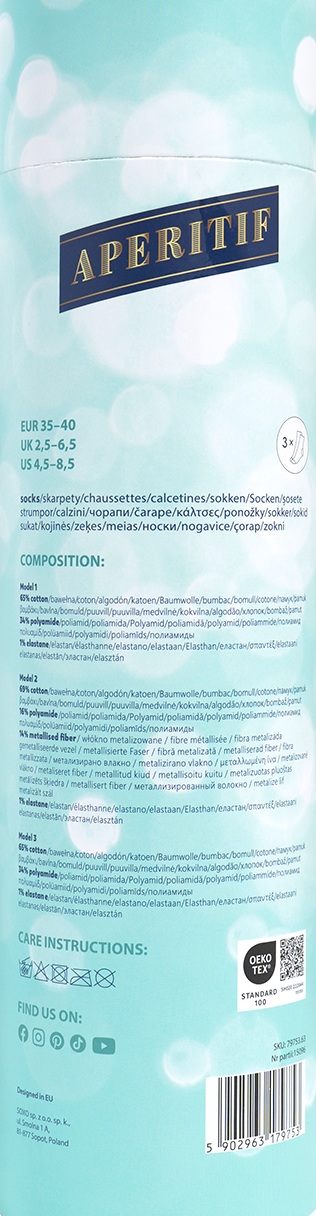Piękne skarpetki są dodatkowo zapakowanie w niecodzienne opakowanie jakim jest butelka do alkoholu z banderolą Aperitif. Skarpetki Aperitif dzięki opakowaniu z pewnością zaskoczy przyszłą właścicielkę. Będą one doskonałym pomysłem na upominek z okazji Dnia Mamy, Walentynek, dla dziewczyny czy koleżanki. Pokaż kreacją swój sposób bycia, pokaż, że jesteś wesołą dziewczyną z poczuciem humoru i obdaruj uśmiechem innych.