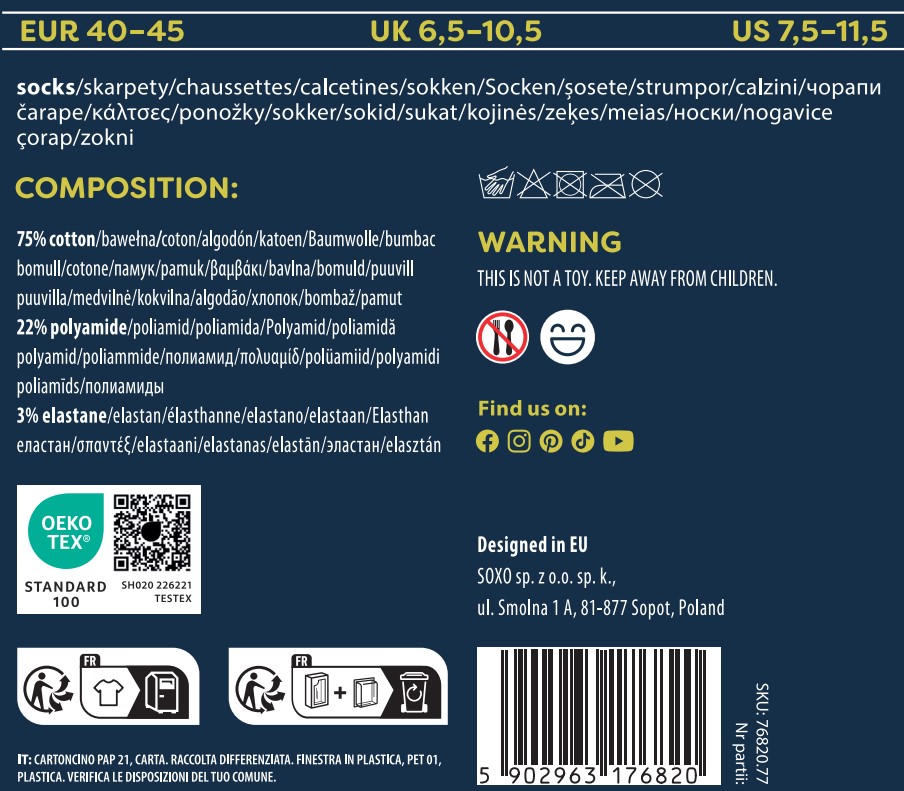 - Skarpetki SOXO zawrócą Ci w głowie! To co je wyróżnia to żywe kolory, ciekawe wzory i niesamowita wygoda, za którą odpowiada najwyższej jakości materiał! Wyrażaj swój styl i nastrój kolorowymi skarpetkami i czuj radość każdego dnia!